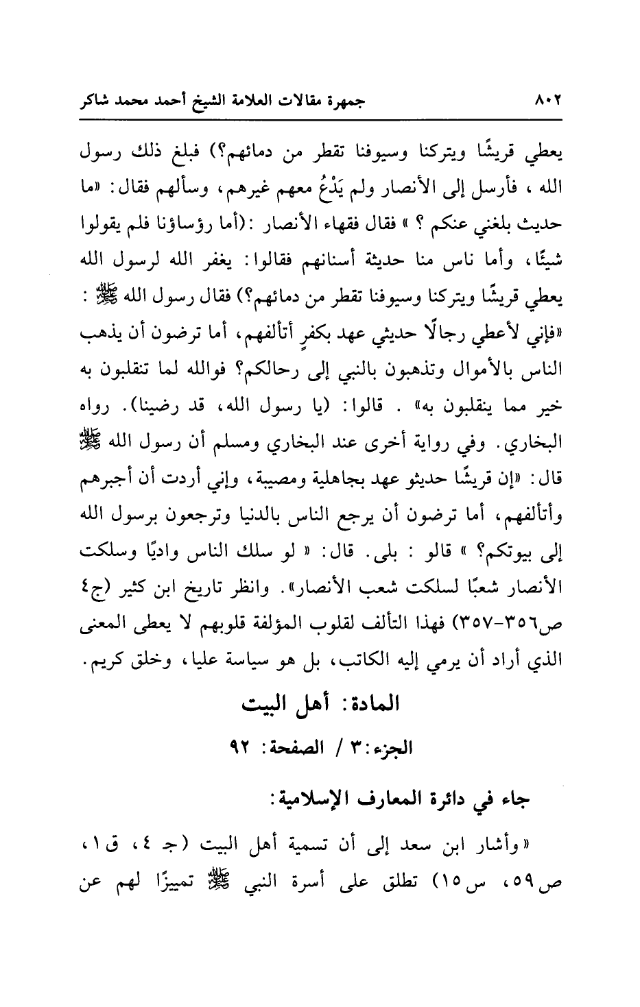 يعطي قريشًا ويتركنا وسيوفنا تقطر من دمائهم؟ ) فبلغ ذلك رسول الله، فأرسل إلى الأنصار ولم يَدْعُ معهم غيرهم، وسألهم فقال: "ما حديث بلغني عنكم؟ " فقال فقهاء الأنصار: (أما رؤساؤنا فلم يقولوا شيئًا، وأما ناس منا حديثة أسنانهم فقالوا: يغفر الله لرسول الله يعطي قريشًا ويتركنا وسيوفنا تقطر من دمائهم؟ ) فقال رسول الله - صلى الله عليه وسلم -: "فإني لأعطي رجالًا حديثي عهد بكفرٍ أتألفهم، أما ترضون أن يذهب الناس بالأموال وتذهبون بالنبي إلى رحالكم؟ فوالله لما تنقلبون به خير مما ينقلبون به". قالوا: (يا رسول الله، قد رضينا). رواه البخاري. وفي رواية أخرى عند البخاري ومسلم أن رسول الله - صلى الله عليه وسلم - قال: "إن قريشًا حديثو عهد بجاهلية ومصيبة، وإني أردت أن أجبرهم وأتألفهم، أما ترضون أن يرجع الناس بالدنيا وترجعون برسول الله إلى بيوتكم؟ " قالو: بلى. قال: "لو سلك الناس واديًا وسلكت الأنصار شعبًا لسلكت شعب الأنصار". وانظر تاريخ ابن كثير (ج 4 ص 356 - 357) فهذا التألف لقلوب المؤلفة قلوبهم لا يعطى المعنى الذي أراد أن يرمي إليه الكاتب، بل هو سياسة عليا، وخلق كريم.