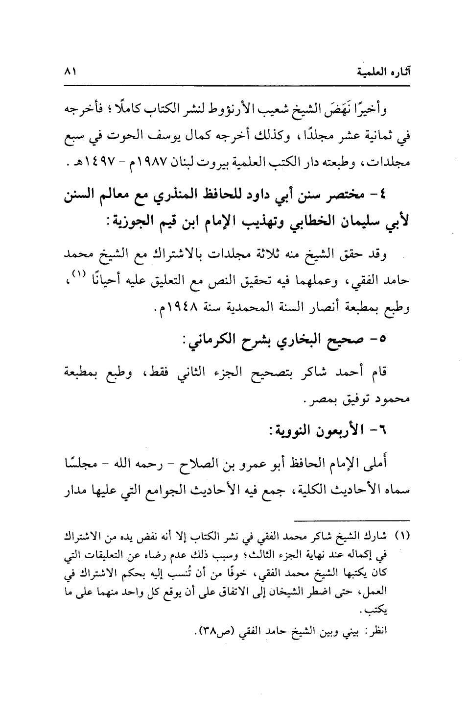 وقد حقق الشيخ منه ثلاثة مجلدات بالاشتراك مع الشيخ محمد حامد الفقي، وعملهما فيه تحقيق النص مع التعليق عليه أحيانًا (¬1)، وطبع بمطبعة أنصار السنة المحمدية سنة 1948 م.