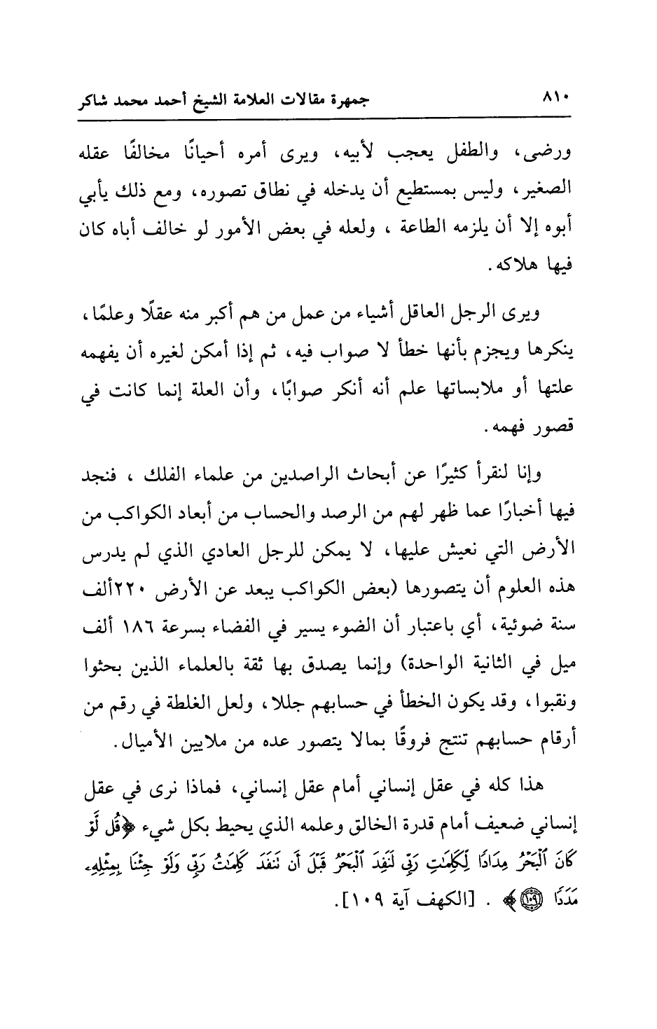 وإنا لنقرأ كثيرًا عن أبحاث الراصدين من علماء الفلك، فنجد فيها أخبارًا عما ظهر لهم من الرصد والحساب من أبعاد الكواكب من الأرض التي نعيش عليها، لا يمكن للرجل العادي الذي لم يدرس هذه العلوم أن يتصورها (بعض الكواكب يبعد عن الأرض 220 ألف سنة ضوئية، أي باعتبار أن الضوء يسير في الفضاء بسرعة 186 ألف ميل في الثانية الواحدة) وإنما يصدق بها ثقة بالعلماء الذين بحثوا ونقبوا، وقد يكون الخطأ في حسابهم جللا، ولعل الغلطة في رقم من أرقام حسابهم تنتج فروقًا بما لا يتصور عده من ملايين الأميال.