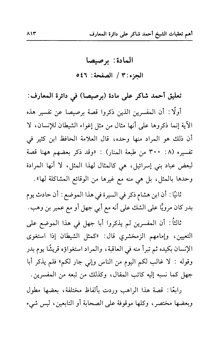 تعليق أحمد شاكر على مادة (برصيصا) في دائرة المعارف: