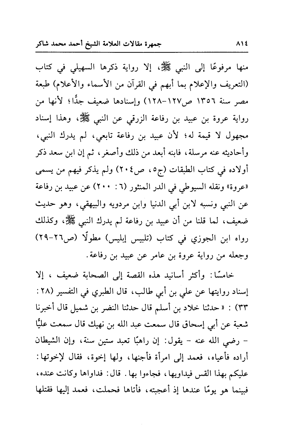 منها مرفوعًا إلى النبي - صلى الله عليه وسلم -، إلا رواية ذكرها السهيلي في كتاب (التعريف والإعلام بما أبهم في القرآن من الأسماء والأعلام) طبعة مصر سنة 1356 ص 127 - 128) وإسنادها ضعيف جدًّا؛ لأنها من رواية عروة بن عبيد بن رفاعة الزرقي عن النبي - صلى الله عليه وسلم -، وهذا إسناد مجهول لا قيمة له؛ لأن عبيد بن رفاعة تابعي، لم يدرك النبي، وأحاديثه عنه مرسلة، فابنه أبعد من ذلك وأصغر، ثم إن ابن سعد ذكر أولاده في كتاب الطبقات (ج 5، ص 204) ولم يذكر فيهم من يسمى "عروة" ونقله السيوطي في الدر المنثور (6: 200) عن عبيد بن رفاعة عن النبي ونسبه لابن أبي الدنيا وابن مردويه والبيهقي، وهو حديث ضعيف، لما قلنا من أن عبيد بن رفاعة لم يدرك النبي - صلى الله عليه وسلم -، وكذلك رواه ابن الجوزي في كتاب (تلبيس إبليس) مطولًا (ص 26 - 29) وجعله من رواية عروة بن عامر عن عبيد بن رفاعة.