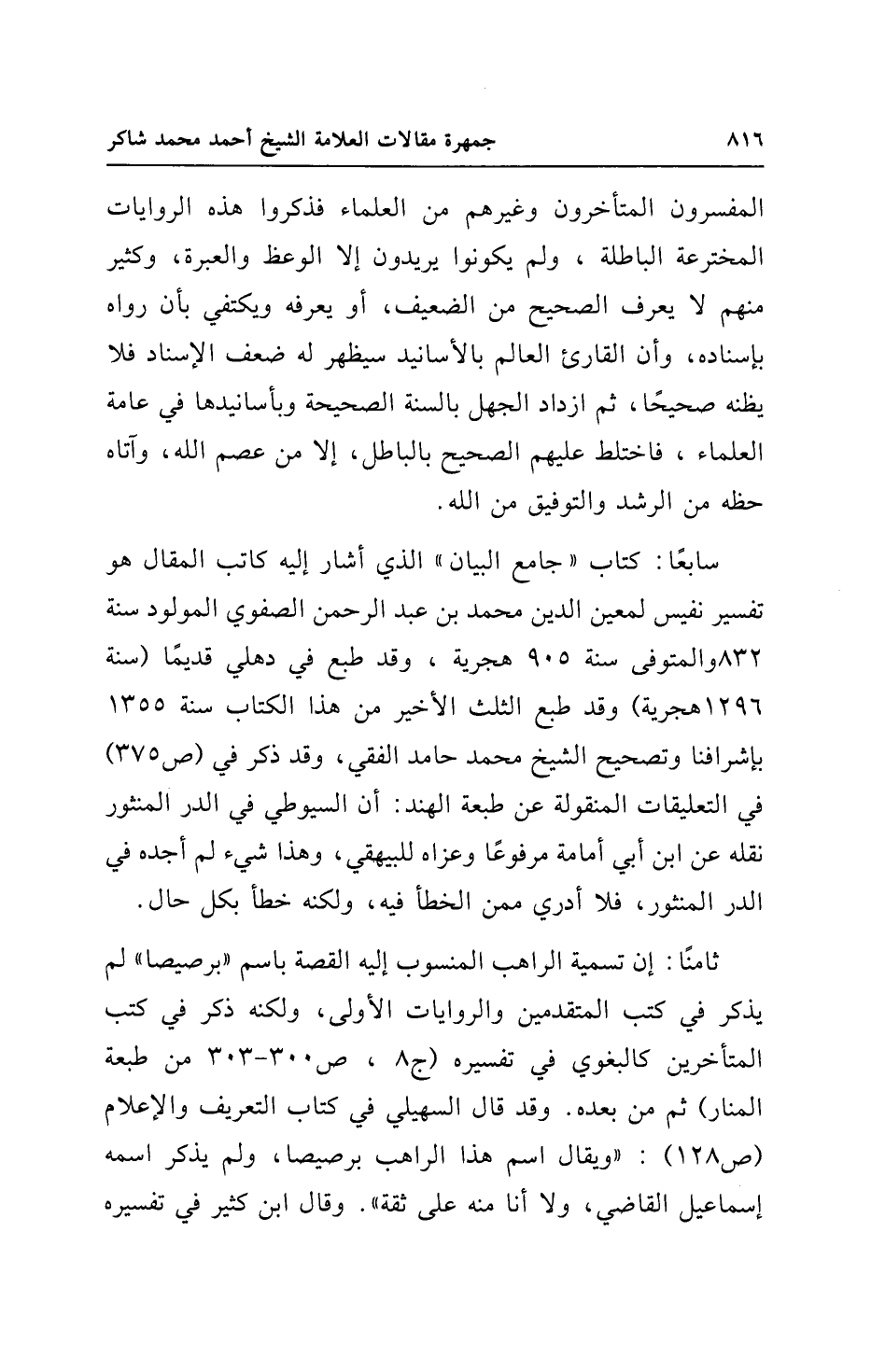 سابعًا: كتاب "جامع البيان" الذي أشار إليه كاتب المقال هو تفسير نفيس لمعين الدين محمد بن عبد الرحمن الصفوي المولود سنة 832 والمتوفى سنة 905 هجرية، وقد طبع في دهلي قديمًا (سنة 1296 هجرية) وقد طبع الثلث الأخير من هذا الكتاب سنة 1355 بإشرافنا وتصحيح الشيخ محمد حامد الفقي، وقد ذكر في (ص 375) في التعليقات المنقولة عن طبعة الهند: أن السيوطي في الدر المنثور نقله عن ابن أبي أمامة مرفوعًا وعزاه للبيهقي، وهذا شيء لم أجده في الدر المنثور، فلا أدري ممن الخطأ فيه، ولكنه خطأ بكل حال.