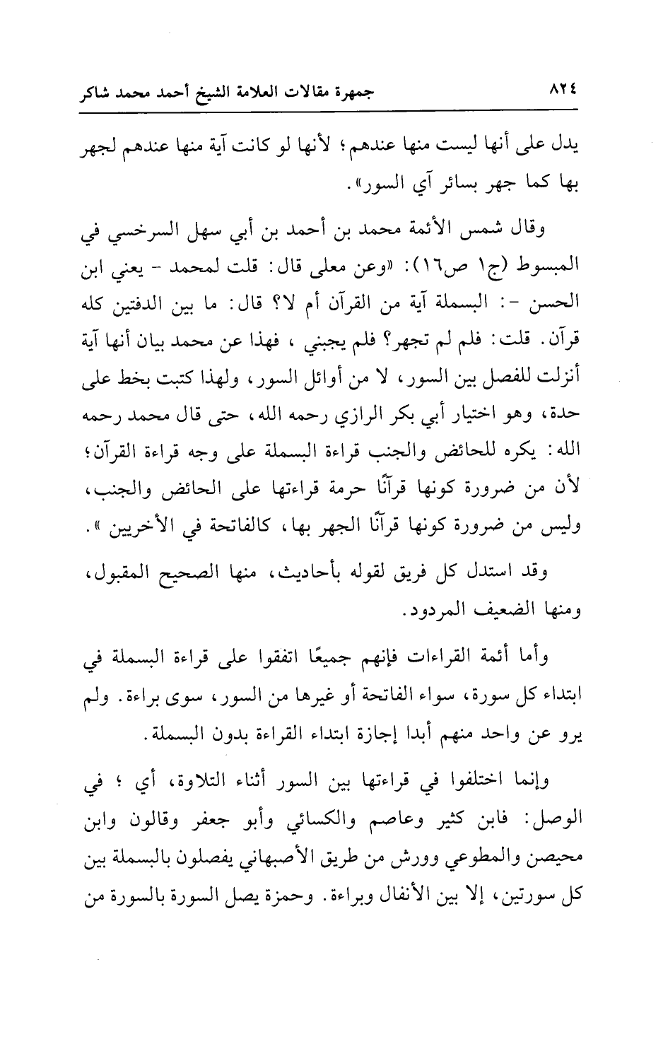 وقال شمس الأئمة محمد بن أحمد بن أبي سهل السرخسي في المبسوط (ج 1 ص 16): "وعن معلى قال: قلت لمحمد - يعني ابن الحسن -: البسملة آية من القرآن أم لا؟ قال: ما بين الدفتين كله قرآن. قلت: فلم لم تجهر؟ فلم يجبني، فهذا عن محمد بيان أنها آية أنزلت للفصل بين السور، لا من أوائل السور، ولهذا كتبت بخط على حدة، وهو اختيار أبي بكر الرازي رحمه الله، حتى قال محمد رحمه الله: يكره للحائض والجنب قراءة البسملة على وجه قراءة القرآن؛ لأن من ضرورة كونها قرآنًا حرمة قراءتها على الحائض والجنب، وليس من ضرورة كونها قرآنًا الجهر بها، كالفاتحة في الأخريين".