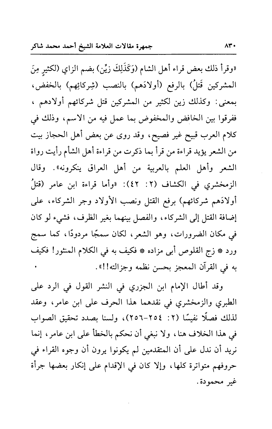 "وقرأ ذلك بعض قراء أهل الشام (وَكَذَلِكَ زيِّن) بضم الزاي (لكثيرٍ مِنَ المشركين قَتلُ) بالرفع (أولادَهم) بالنصب (شِركائِهم) بالخفض، بمعنى: وكذلك زين لكثير من المشركين قتل شركائهم أولادهم، ففرقوا بين الخافض والمخفوض بما عمل فيه من الاسم، وذلك في كلام العرب قبيح غير فصيح، وقد روى عن بعض أهل الحجاز بيت من الشعر يؤيد قراءة من قرأ بما ذكرت من قراءة أهل الشأم رأيت رواة الشعر وأهل العلم بالعربية من أهل العراق ينكرونه". وقال الزمخشري في الكشاف (2: 42): "وأما قراءة ابن عامر (قتلُ أولادَهم شركائهم) برفع القتل ونصب الأولاد وجر الشركاء، على إضافة القتل إلى الشركاء، والفصل بينهما بغير الظرف، فشيء لو كان في مكان الضرورات، وهو الشعر، لكان سمجًا مردودًا، كما سمج ورد * زج القلوص أبى مزاده * فكيف به في الكلام المنثور! فكيف به في القرآن المعجز بحسن نظمه وجزالته! ! ".