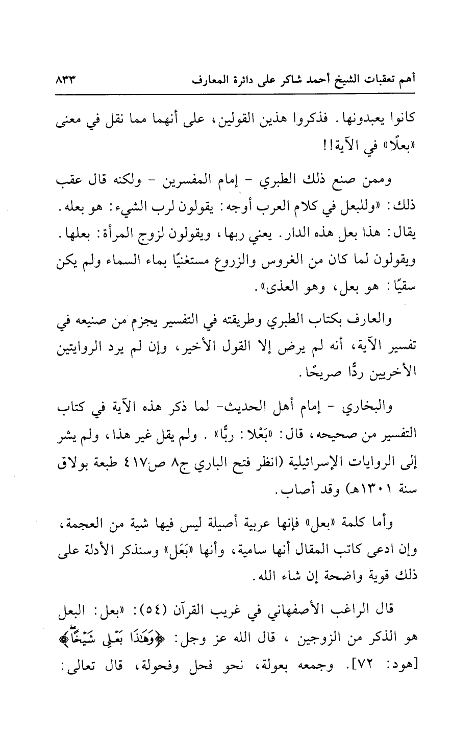 وممن صنع ذلك الطبري - إمام المفسرين - ولكنه قال عقب ذلك: "وللبعل في كلام العرب أوجه: يقولون لرب الشيء: هو بعله. يقال: هذا بعل هذه الدار. يعني ربها، ويقولون لزوج المرأة: بعلها. ويقولون لما كان من الغروس والزروع مستغنيًا بماء السماء ولم يكن سقيًا: هو بعل، وهو العذى".