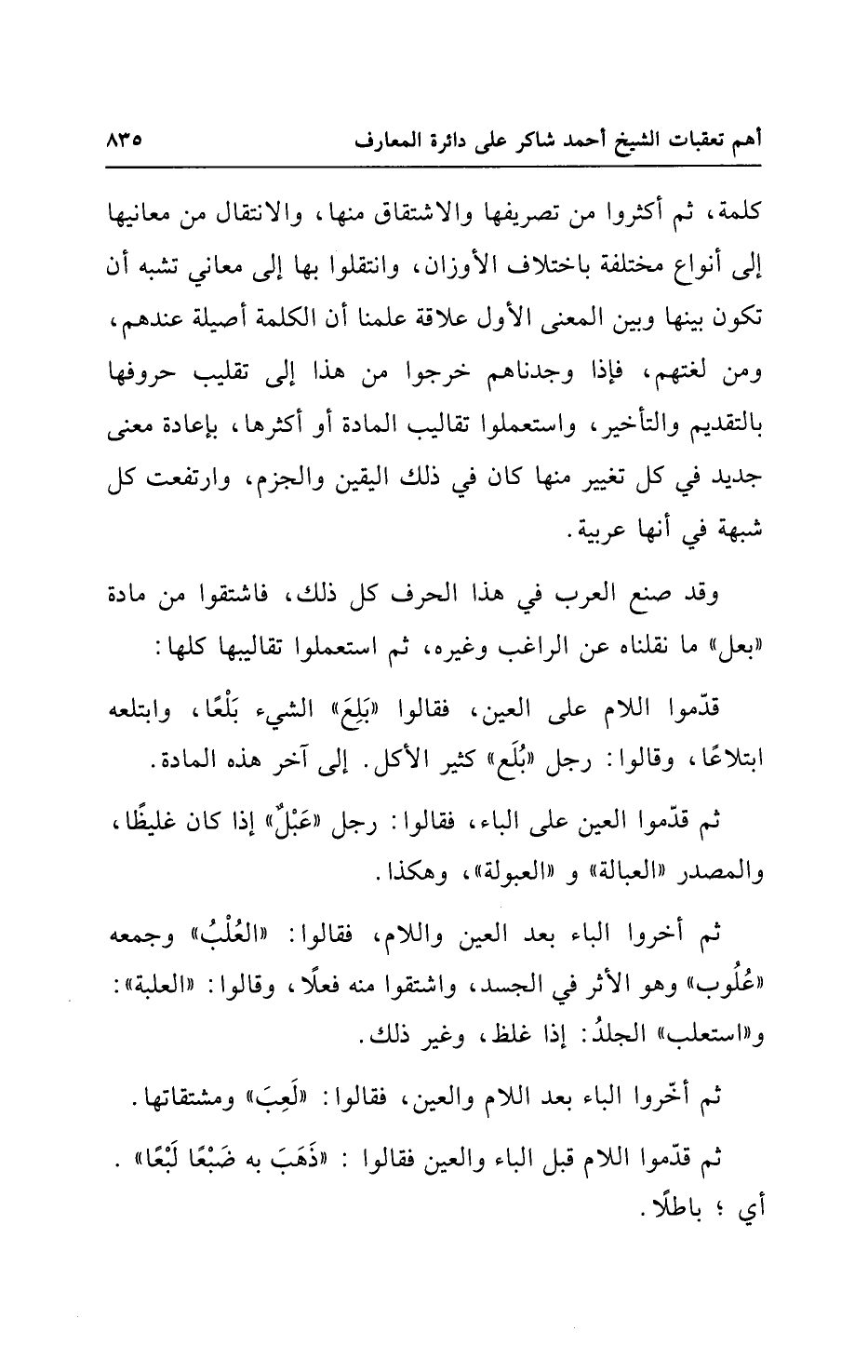 قدّموا اللام على العين، فقالوا "بَلِعَ" الشيء بَلْعًا، وابتلعه ابتلاعًا، وقالوا: رجل "بُلَع" كثير الأكل. إلى آخر هذه المادة.