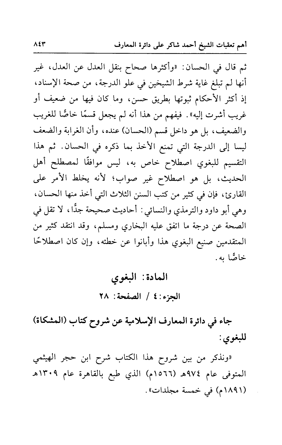 جاء في دائرة المعارف الإسلامية عن شروح كتاب (المشكاة) للبغوي: