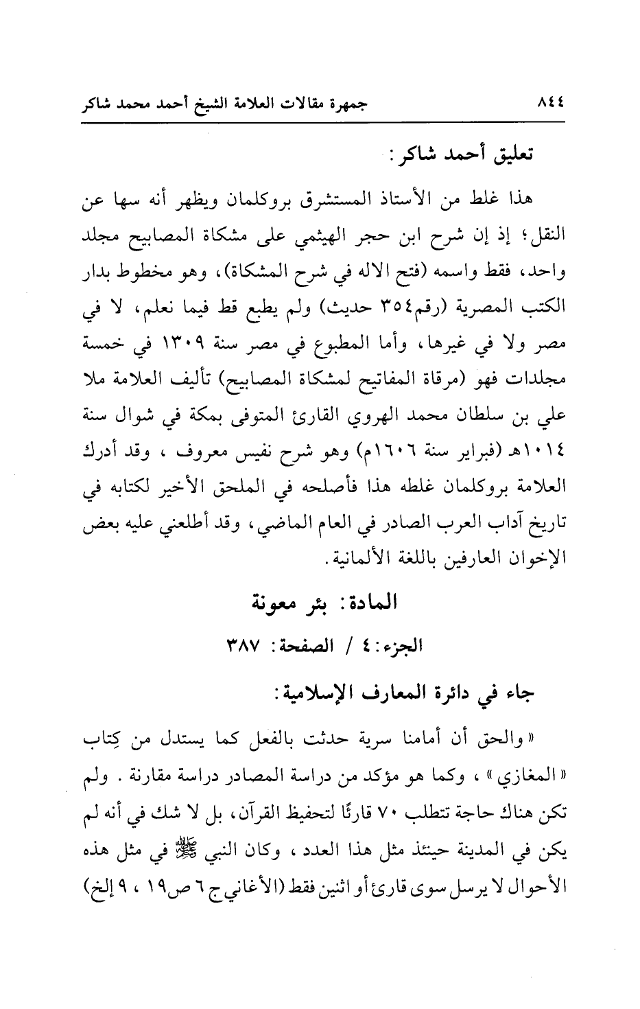 هذا غلط من الأستاذ المستشرق بروكلمان ويظهر أنه سها عن النقل؛ إذ إن شرح ابن حجر الهيثمي على مشكاة المصابيح مجلد واحد، فقط واسمه (فتح الاله في شرح المشكاة)، وهو مخطوط بدار الكتب المصرية (رقم 354 حديث) ولم يطبع قط فيما نعلم، لا في مصر ولا في غيرها، وأما المطبوع في مصر سنة 1309 في خمسة مجلدات فهو (مرقاة المفاتيح لمشكاة المصابيح) تأليف العلامة ملا علي بن سلطان محمد الهروي القارئ المتوفى بمكة في شوال سنة 1014 هـ (فبراير سنة 1606 م) وهو شرح نفيس معروف، وقد أدرك العلامة بروكلمان غلطه هذا فأصلحه في الملحق الأخير لكتابه في تاريخ آداب العرب الصادر في العام الماضي، وقد أطلعني عليه بعض الإخوان العارفين باللغة الألمانية.
