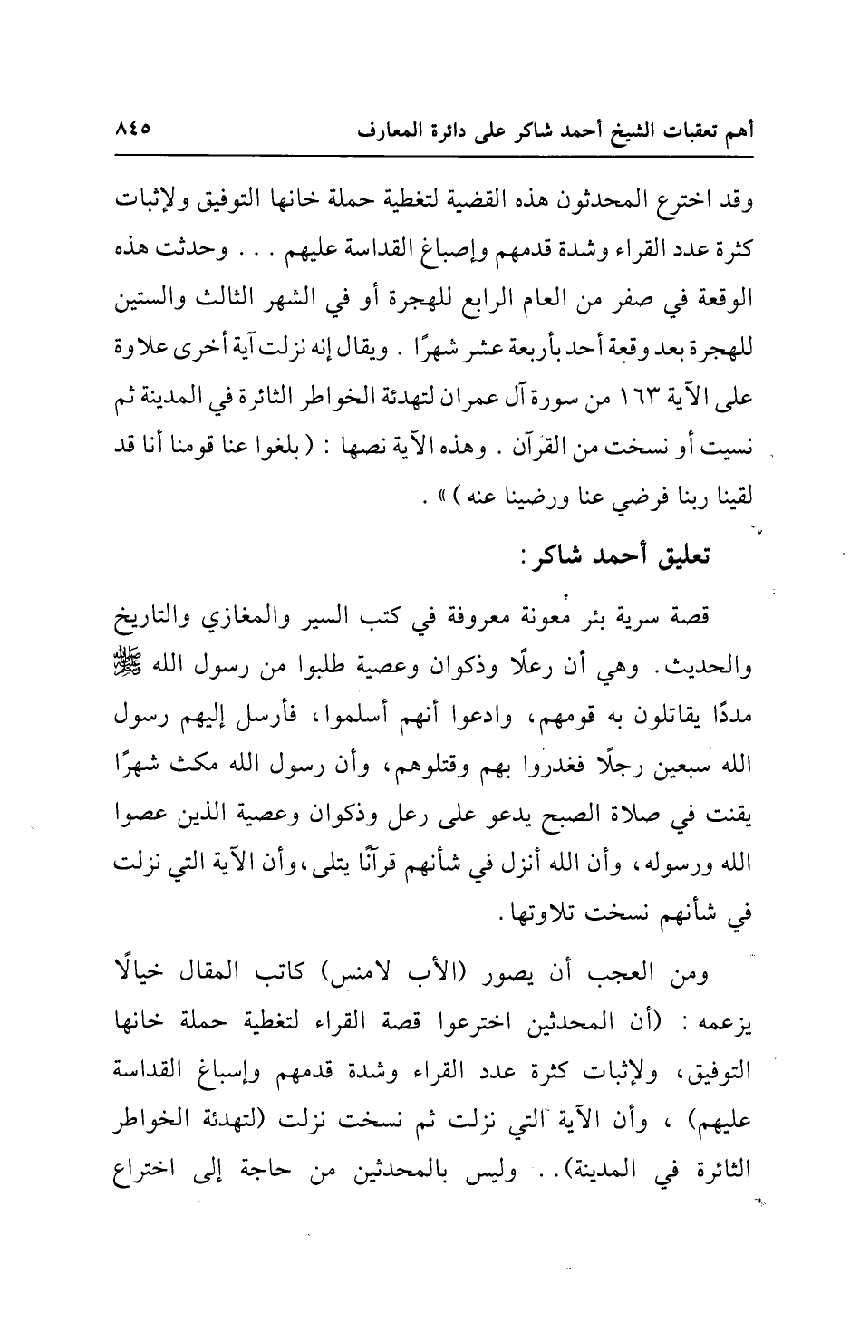 وقد اخترع المحدثون هذه القضية لتغطية حملة خانها التوفيق ولإثبات كثرة عدد القراء وشدة قدمهم وإصباغ القداسة عليهم ... وحدثت هذه الوقعة في صفر من العام الرابع للهجرة أو في الشهر الثالث والستين للهجرة بعد وقعة أحد بأربعة عشر شهرًا. ويقال إنه نزلت آية أخرى علاوة على الآية 163 من سورة آل عمران لتهدئة الخواطر الثائرة في المدينة ثم نسيت أو نسخت من القرآن. وهذه الآية نصها: (بلغوا عنا قومنا أنا قد لقينا ربنا فرضي عنا ورضينا عنه) ".
