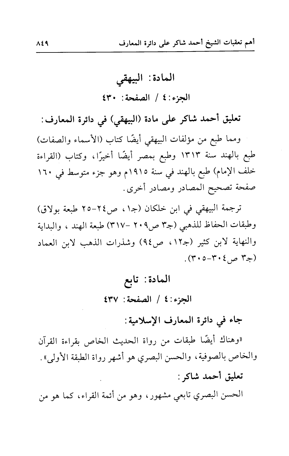 تعليق أحمد شاكر على مادة (البيهقي) في دائرة المعارف: