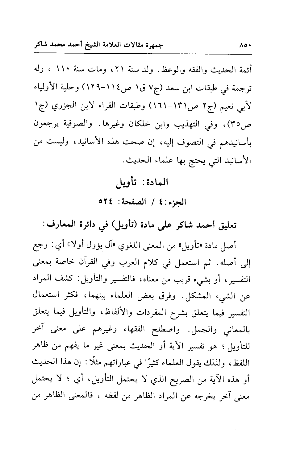تعليق أحمد شاكر على مادة (تأويل) في دائرة المعارف: