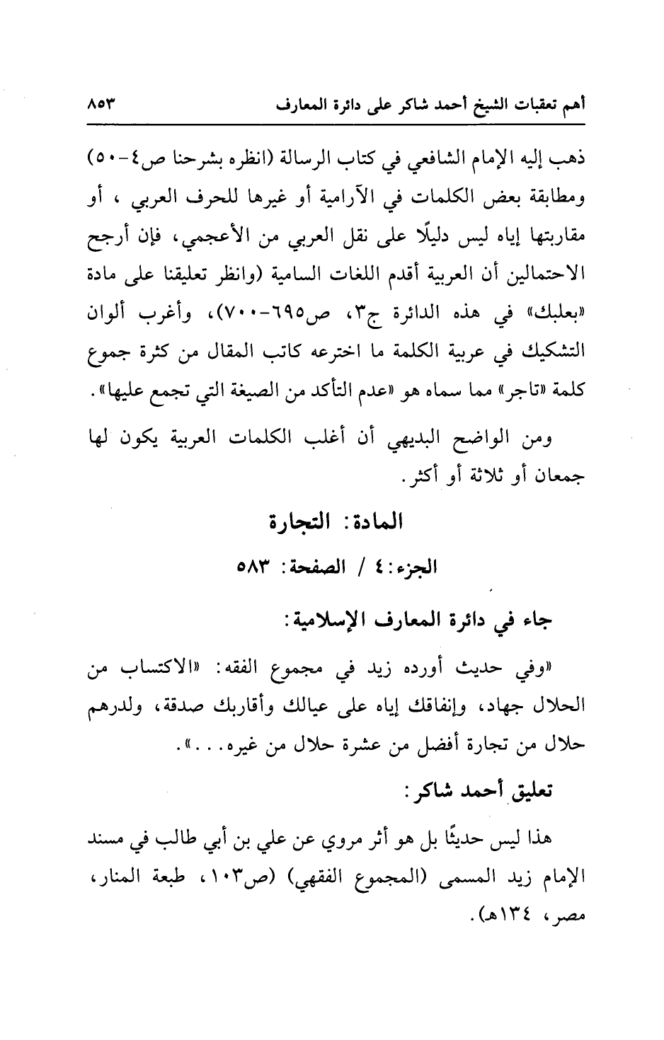 ذهب إليه الإمام الشافعي في كتاب الرسالة (انظره بشرحنا ص 4 - 50) ومطابقة بعض الكلمات في الآرامية أو غيرها للحرف العربي، أو مقاربتها إياه ليس دليلًا على نقل العربي من الأعجمي، فإن أرجح الاحتمالين أن العربية أقدم اللغات السامية (وانظر تعليقنا على مادة "بعلبك" في هذه الدائرة ج 3، ص 695 - 700)، وأغرب ألوان التشكيك في عربية الكلمة ما اخترعه كاتب المقال من كثرة جموع كلمة "تاجر" مما سماه هو "عدم التأكد من الصيغة التي تجمع عليها".