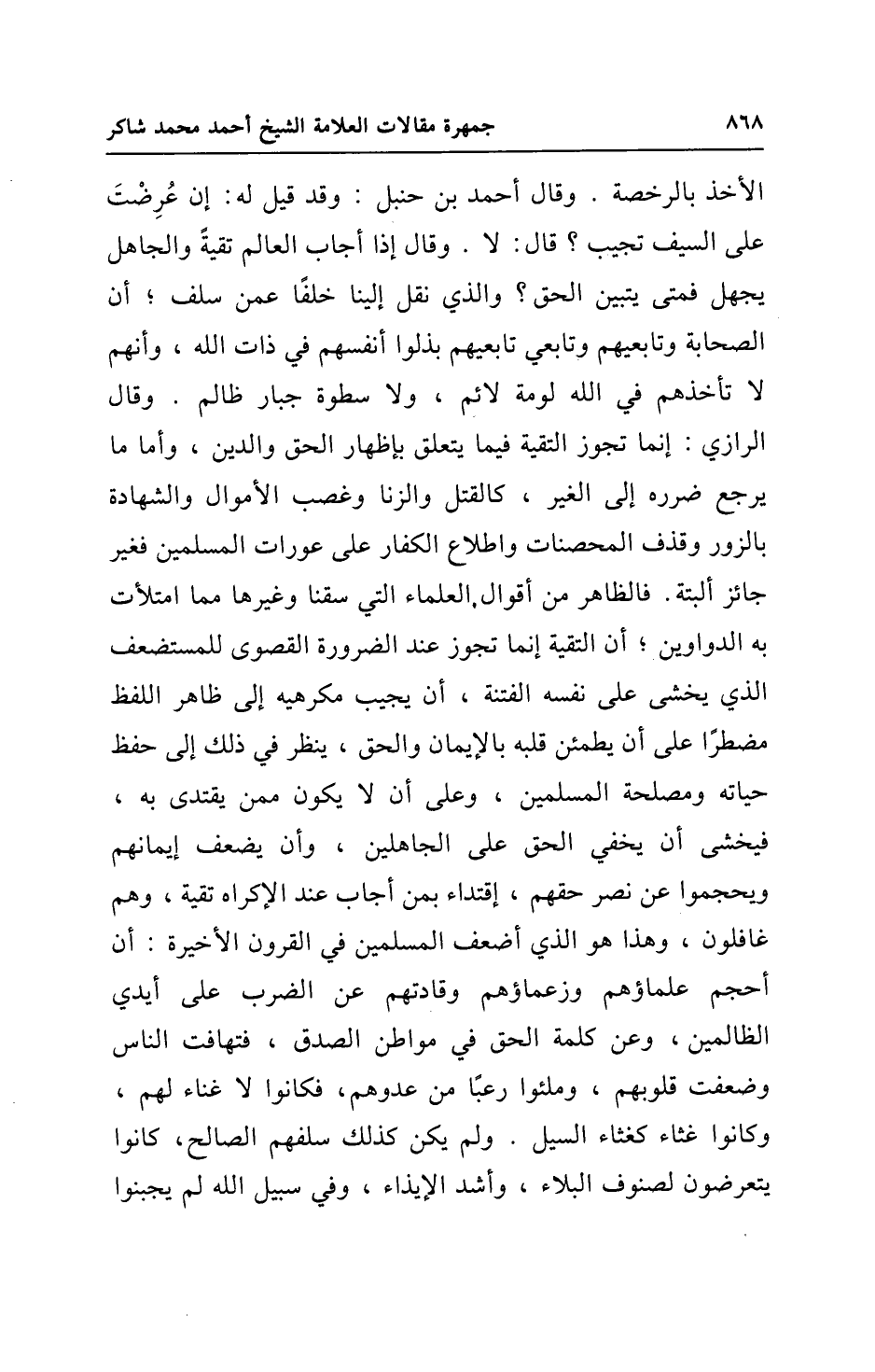 الأخذ بالرخصة. وقال أحمد بن حنبل: وقد قيل له: إن عُرِضْتَ على السيف تجيب؟ قال: لا. وقال إذا أجاب العالم تقيةً والجاهل يجهل فمتى يتبين الحق؟ والذي نقل إلينا خلفًا عمن سلف؛ أن الصحابة وتابعيهم وتابعي تابعيهم بذلوا أنفسهم في ذات الله، وأنهم لا تأخذهم في الله لومة لائم، ولا سطوة جبار ظالم. وقال الرازي: إنما تجوز التقية فيما يتعلق بإظهار الحق والدين، وأما ما يرجع ضرره إلى الغير، كالقتل والزنا وغصب الأموال والشهادة بالزور وقذف المحصنات واطلاع الكفار على عورات المسلمين فغير جائز ألبتة. فالظاهر من أقوال العلماء التي سقنا وغيرها مما امتلأت به الدواوين؛ أن التقية إنما تجوز عند الضرورة القصوى للمستضعف الذي يخشى على نفسه الفتنة، أن يجيب مكرهيه إلى ظاهر اللفظ مضطرًا على أن يطمئن قلبه بالإيمان والحق، ينظر في ذلك إلى حفظ حياته ومصلحة المسلمين، وعلى أن لا يكون ممن يقتدى به، فيخشى أن يخفي الحق على الجاهلين، وأن يضعف إيمانهم ويحجموا عن نصر حقهم، إقتداء بمن أجاب عند الإكراه تقية، وهم غافلون، وهذا هو الذي أضعف المسلمين في القرون الأخيرة: أن أحجم علماؤهم وزعماؤهم وقادتهم عن الضرب على أيدي الظالمين، وعن كلمة الحق في مواطن الصدق، فتهافت الناس وضعفت قلوبهم، وملئوا رعبًا من عدوهم، فكانوا لا غناء لهم، وكانوا غثاء كغثاء السيل. ولم يكن كذلك سلفهم الصالح، كانوا يتعرضون لصنوف البلاء، وأشد الإيذاء، وفي سبيل الله لم يجبنوا