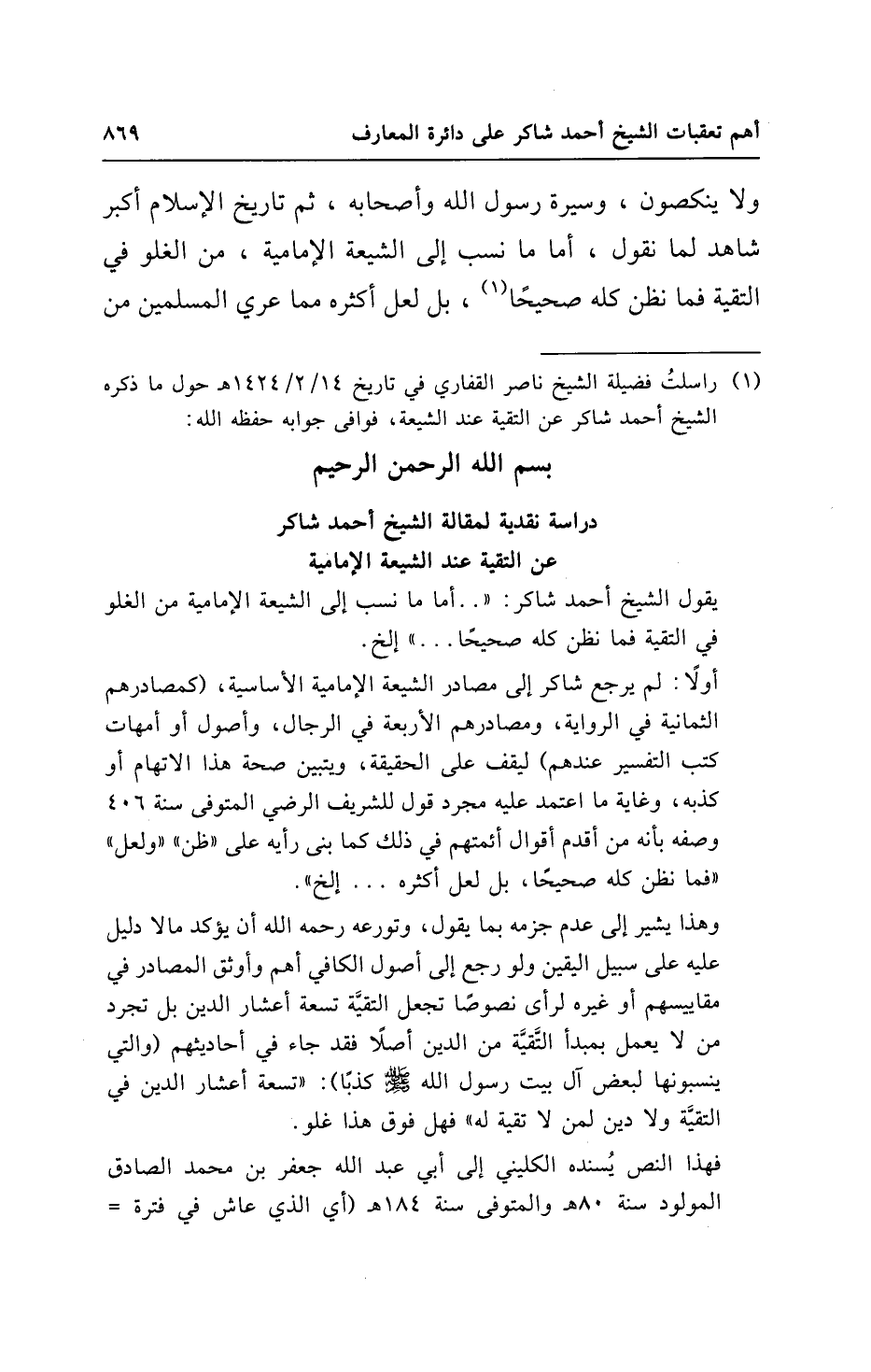 (¬1) راسلتُ فضيلة الشيخ ناصر القفاري في تاريخ 14/ 2/ 1424 هـ حول ما ذكره الشيخ أحمد شاكر عن التقية عند الشيعة، فوافى جوابه حفظه الله: