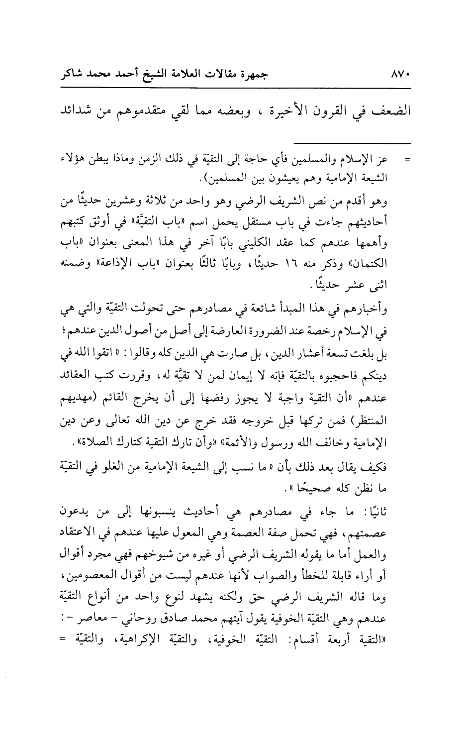 وأخبارهم في هذا المبدأ شائعة في مصادرهم حتى تحولت التقيّة والتي هي في الإسلام رخصة عند الضرورة العارضة إلى أصل من أصول الدين عندهم؛ بل بلغت تسعة أعشار الدين، بل صارت هي الدين كله وقالوا: "اتقوا الله في دينكم فاحجبوه بالتقيّة فإنه لا إيمان لمن لا تقيَّة له، وقررت كتب العقائد عندهم "أن التقية واجبة لا يجوز رفضها إلى أن يخرج القائم (مهديهم المنتظر) فمن تركها قبل خروجه فقد خرج عن دين الله تعالى وعن دين الإمامية وخالف الله ورسول والأئمة" "وأن تارك التقية كتارك الصلاة". فكيف يقال بعد ذلك بأن "ما نسب إلى الشيعة الإمامية من الغلو في التقيّة ما نظن كله صحيحًا".