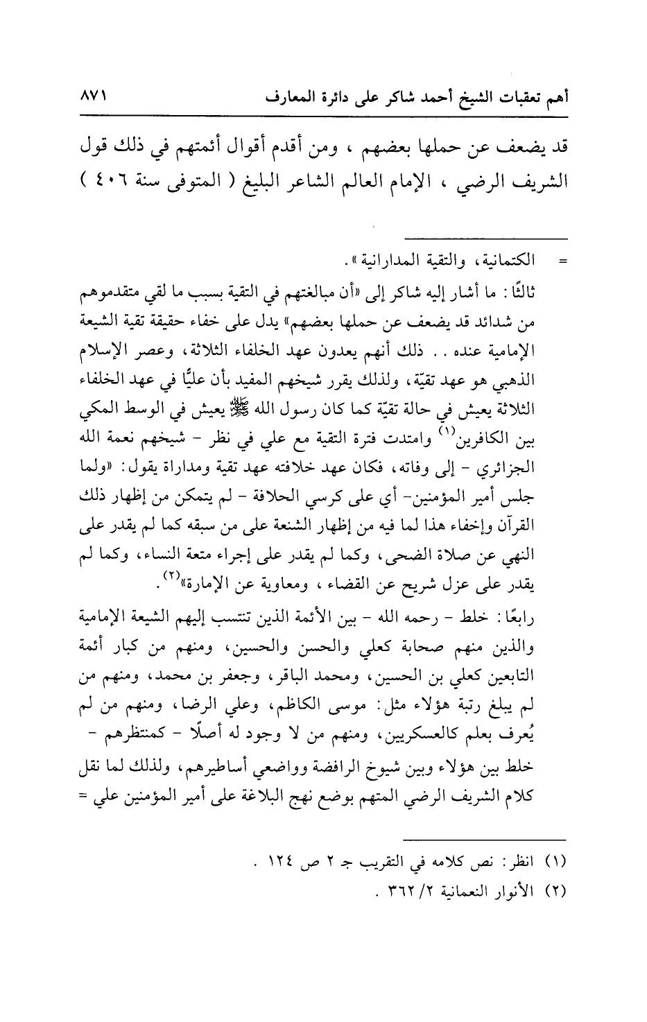 ثالثًا: ما أشار إليه شاكر إلى "أن مبالغتهم في التقية بسبب ما لقي متقدموهم من شدائد قد يضعف عن حملها بعضهم" يدل على خفاء حقيقة تقية الشيعة الإمامية عنده .. ذلك أنهم يعدون عهد الخلفاء الثلاثة، وعصر الإسلام الذهبي هو عهد تقية، ولذلك يقرر شيخهم المفيد بأن عليًّا في عهد الخلفاء الثلاثة يعيش في حالة تقيّة كما كان رسول الله - صلى الله عليه وسلم - يعيش في الوسط المكي بين الكافرين (1) وامتدت فترة التقية مع علي في نظر - شيخهم نعمة الله الجزائري - إلى وفاته، فكان عهد خلافته عهد تقية ومداراة يقول: "ولما جلس أمير المؤمنين - أي على كرسي الخلافة - لم يتمكن من إظهار ذلك القرآن وإخفاء هذا لما فيه من إظهار الشنعة على من سبقه كما لم يقدر على النهي عن صلاة الضحى، وكما لم يقدر على إجراء متعة النساء، وكما لم يقدر على عزل شريح عن القضاء، ومعاوية عن الإمارة" (2).