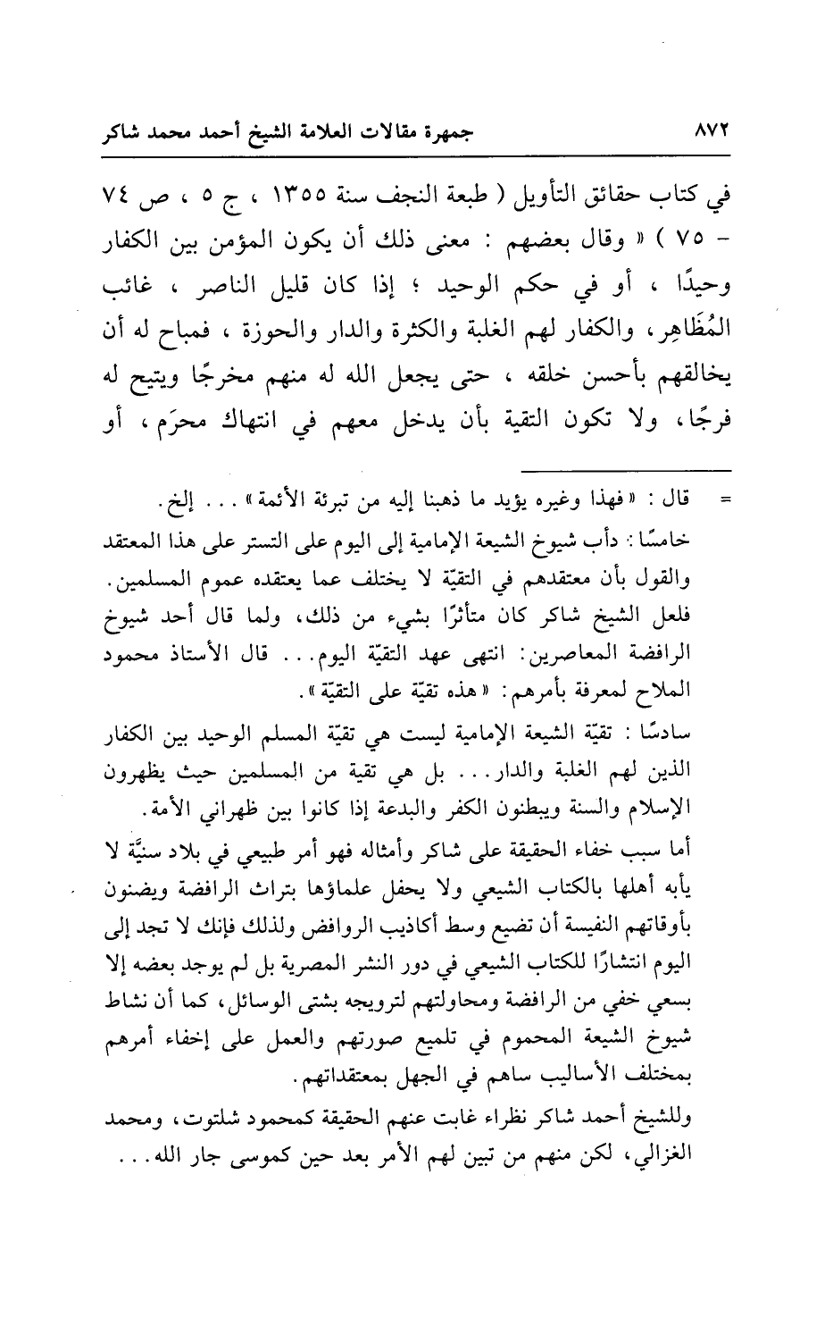 خامسًا: "دأب شيوخ الشيعة الإمامية إلى اليوم على التستر على هذا المعتقد والقول بأن معتقدهم في التقيّة لا يختلف عما يعتقده عموم المسلمين. فلعل الشيخ شاكر كان متأثرًا بشيء من ذلك، ولما قال أحد شيوخ الرافضة المعاصرين: انتهى عهد التقيّة اليوم ... قال الأستاذ محمود الملاح لمعرفة بأمرهم: "هذه تقيّة على التقيّة".
