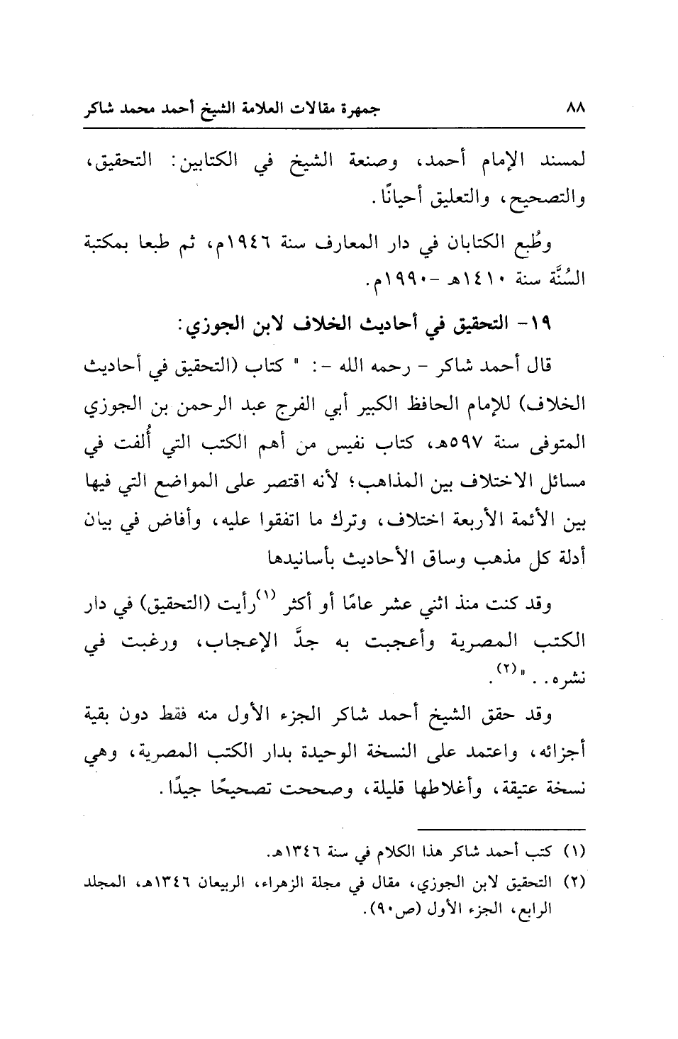(¬2) التحقيق لابن الجوزي، مقال في مجلة الزهراء، الربيعان 1346 هـ، المجلد الرابع، الجزء الأول (ص 90).