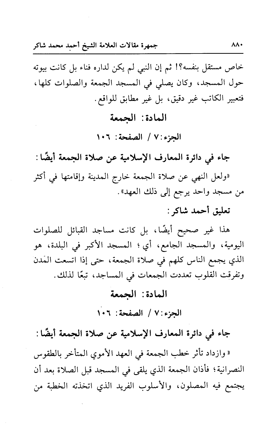 "ولعل النهي عن صلاة الجمعة خارج المدينة وإقامتها في أكثر من مسجد واحد يرجع إلى ذلك العهد".