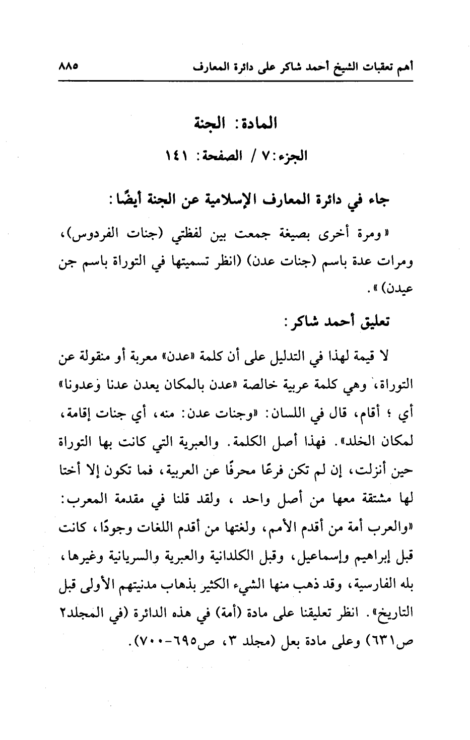 لا قيمة لهذا في التدليل على أن كلمة "عدن" معربة أو منقولة عن التوراة، وهي كلمة عربية خالصة "عدن بالمكان يعدن عدنا وعدونا" أي؛ أقام، قال في اللسان: "وجنات عدن: منه، أي جنات إقامة، لمكان الخلد". فهذا أصل الكلمة. والعبرية التي كانت بها التوراة حين أنزلت، إن لم تكن فرعًا محرفًا عن العربية، فما تكون إلا أختا لها مشتقة معها من أصل واحد، ولقد قلنا في مقدمة المعرب: "والعرب أمة من أقدم الأمم، ولغتها من أقدم اللغات وجودًا، كانت قبل إبراهيم وإسماعيل، وقبل الكلدانية والعبرية والسريانية وغيرها، بله الفارسية، وقد ذهب منها الشيء الكثير بذهاب مدنيتهم الأولى قبل التاريخ". انظر تعليقنا على مادة (أمة) في هذه الدائرة (في المجلد 2 ص 631) وعلى مادة بعل (مجلد 3، ص 695 - 700).