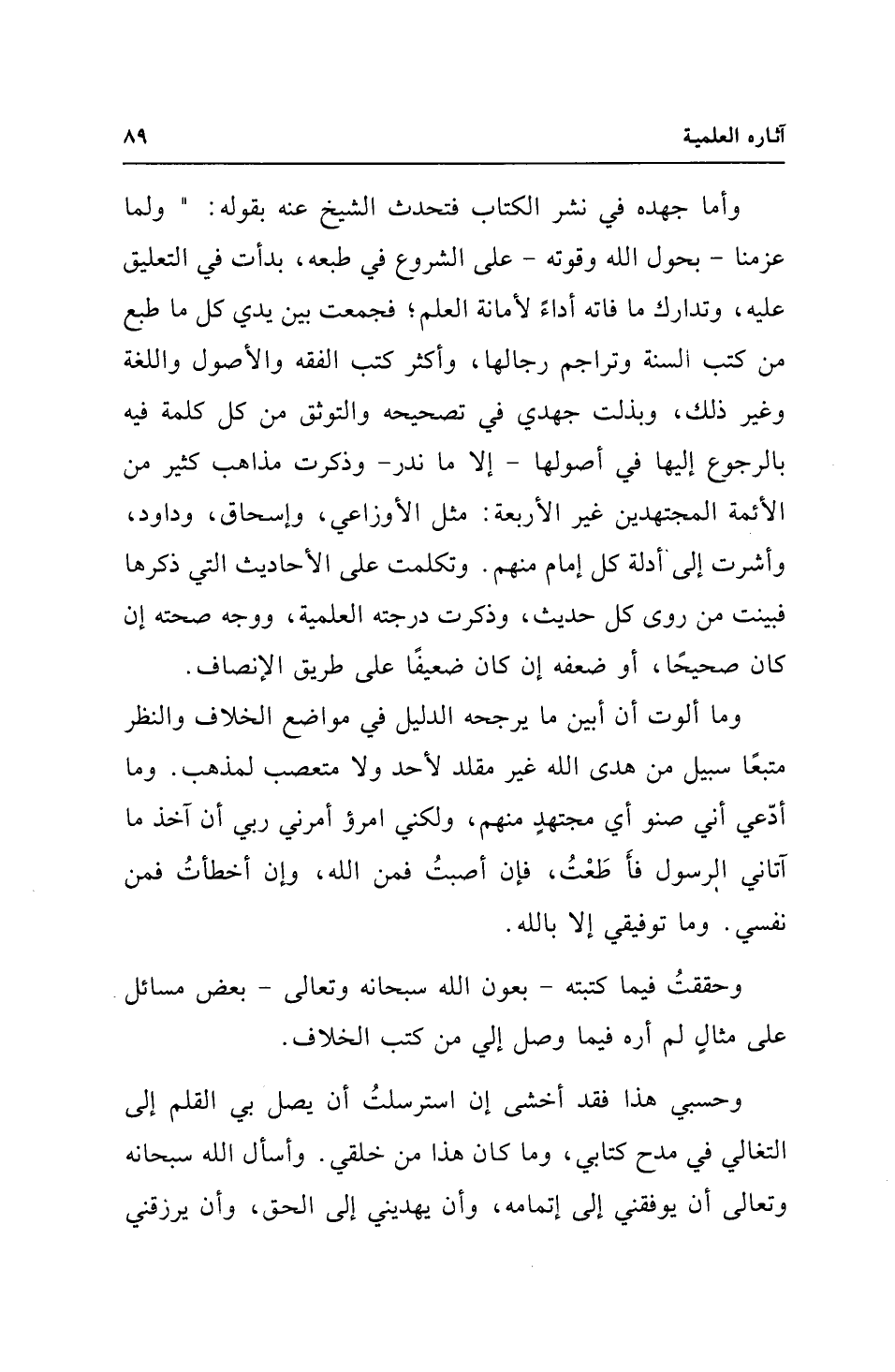 وما ألوت أن أبين ما يرجحه الدليل في مواضع الخلاف والنظر متبعًا سبيل من هدى الله غير مقلد لأحد ولا متعصب لمذهب. وما أدّعي أني صنو أي مجتهدٍ منهم، ولكني امرؤ أمرني ربي أن آخذ ما آتاني الرسول فأَطَعْتُ، فإن أصبتُ فمن الله، وإن أخطأتُ فمن نفسي. وما توفيقي إلا بالله.