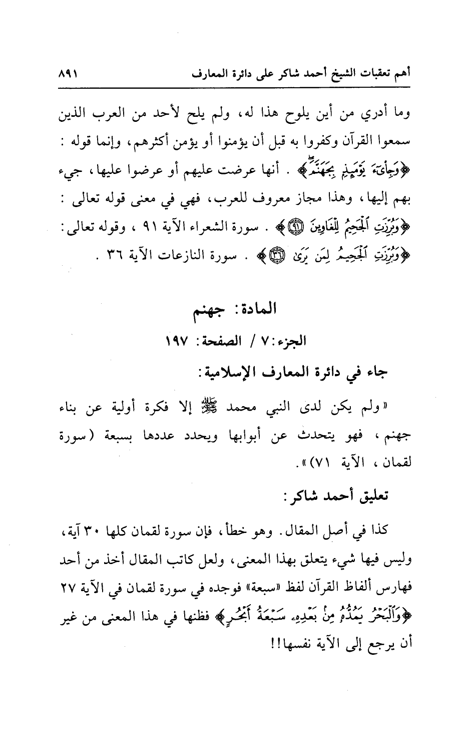 وما أدري من أين يلوح هذا له، ولم يلح لأحد من العرب الذين سمعوا القرآن وكفروا به قبل أن يؤمنوا أو يؤمن أكثرهم، وإنما قوله: {وَجِيءَ يَوْمَئِذٍ بِجَهَنَّمَ}. أنها عرضت عليهم أو عرضوا عليها، جيء بهم إليها، وهذا مجاز معروف للعرب، فهي في معنى قوله تعالى: {وَبُرِّزَتِ الْجَحِيمُ لِلْغَاوِينَ (91)}. سورة الشعراء الآية 91، وقوله تعالى: {وَبُرِّزَتِ الْجَحِيمُ لِمَنْ يَرَى (36)}. سورة النازعات الآية 36.