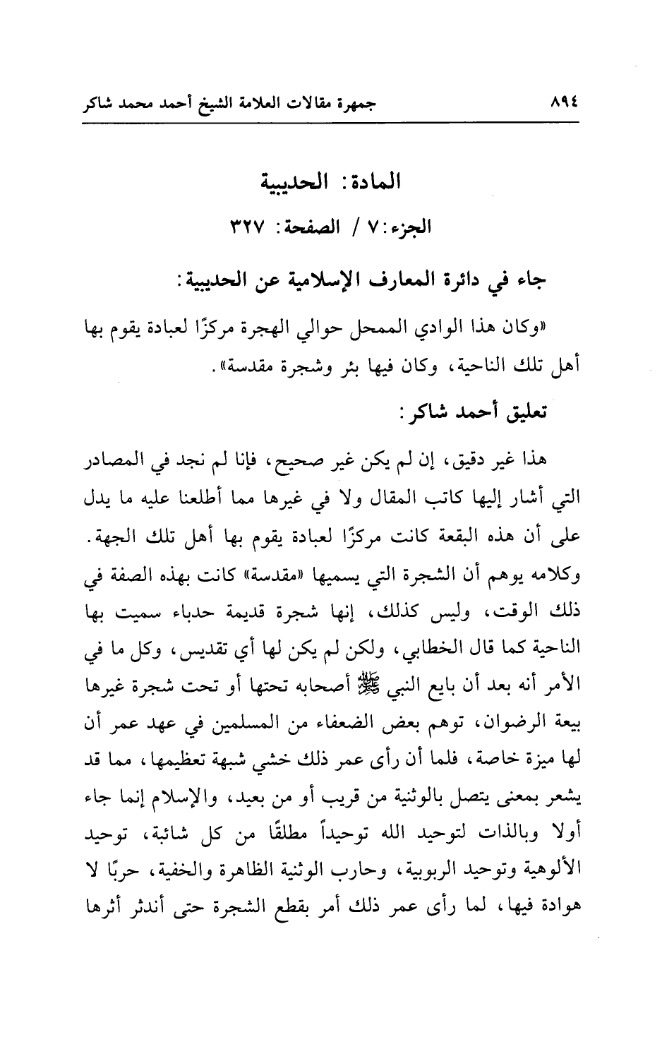 هذا غير دقيق، إن لم يكن غير صحيح، فإنا لم نجد في المصادر التي أشار إليها كاتب المقال ولا في غيرها مما أطلعنا عليه ما يدل على أن هذه البقعة كانت مركزًا لعبادة يقوم بها أهل تلك الجهة. وكلامه يوهم أن الشجرة التي يسميها "مقدسة" كانت بهذه الصفة في ذلك الوقت، وليس كذلك، إنها شجرة قديمة حدباء سميت بها الناحية كما قال الخطابي، ولكن لم يكن لها أي تقديس، وكل ما في الأمر أنه بعد أن بايع النبي - صلى الله عليه وسلم - أصحابه تحتها أو تحت شجرة غيرها بيعة الرضوان، توهم بعض الضعفاء من المسلمين في عهد عمر أن لها ميزة خاصة، فلما أن رأى عمر ذلك خشي شبهة تعظيمها، مما قد يشعر بمعنى يتصل بالوثنية من قريب أو من بعيد، والإسلام إنما جاء أولا وبالذات لتوحيد الله توحيدًا مطلقًا من كل شائبة، توحيد الألوهية وتوحيد الربوبية، وحارب الوثنية الظاهرة والخفية، حربًا لا هوادة فيها، لما رأى عمر ذلك أمر بقطع الشجرة حتى أندثر أثرها
