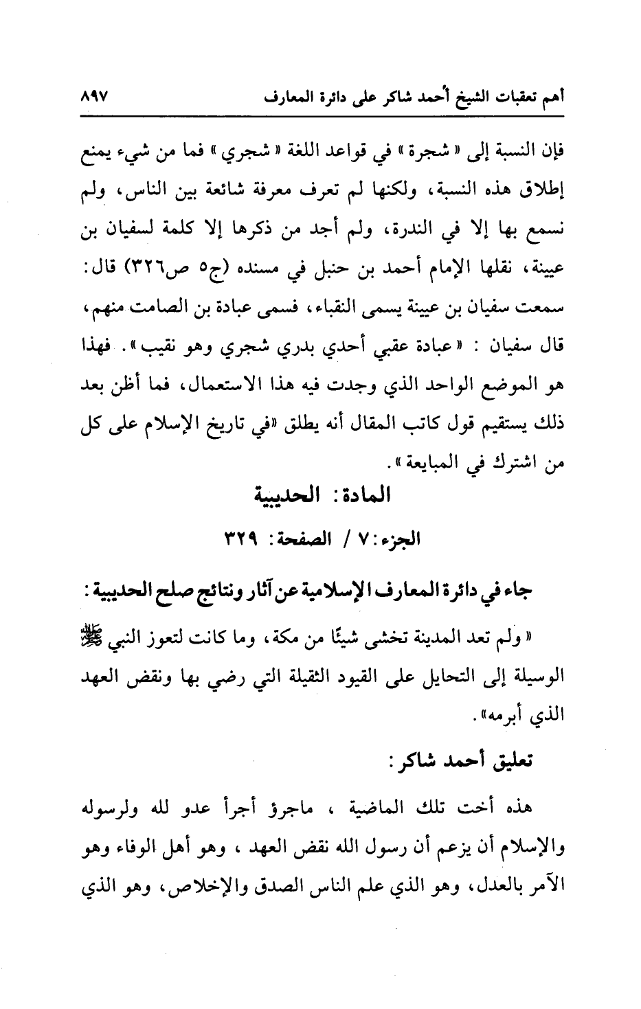 فإن النسبة إلى "شجرة" في قواعد اللغة "شجري" فما من شيء يمنع إطلاق هذه النسبة، ولكنها لم تعرف معرفة شائعة بين الناس، ولم نسمع بها إلا في الندرة، ولم أجد من ذكرها إلا كلمة لسفيان بن عيينة، نقلها الإمام أحمد بن حنبل في مسنده (ج 5 ص 326) قال: سمعت سفيان بن عيينة يسمى النقباء، فسمى عبادة بن الصامت منهم، قال سفيان: "عبادة عقبي أحدي بدري شجري وهو نقيب". فهذا هو الموضع الواحد الذي وجدت فيه هذا الاستعمال، فما أظن بعد ذلك يستقيم قول كاتب المقال أنه يطلق "في تاريخ الإسلام على كل من اشترك في المبايعة".