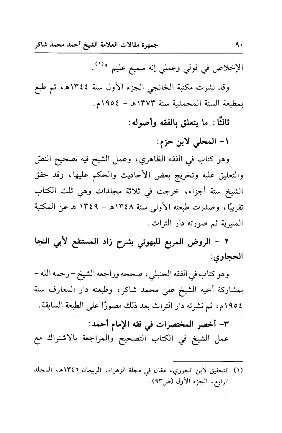 وهو كتاب في الفقه الحنبلي، صححه وراجعه الشيخ - رحمه الله - بمشاركة أخيه الشيخ علي محمد شاكر، وطبعته دار المعارف سنة 1954 م، ثم نشرته دار التراث بعد ذلك مصورًا على الطبعة السابقة.