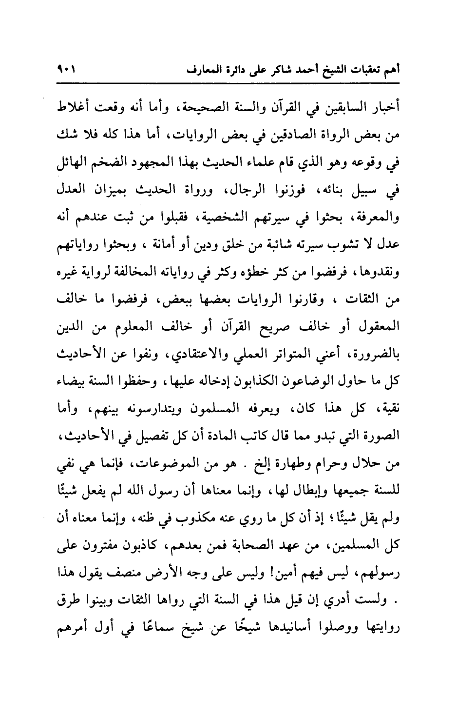 أخبار السابقين في القرآن والسنة الصحيحة، وأما أنه وقعت أغلاط من بعض الرواة الصادقين في بعض الروايات، أما هذا كله فلا شك في وقوعه وهو الذي قام علماء الحديث بهذا المجهود الضخم الهائل في سبيل بنائه، فوزنوا الرجال، ورواة الحديث بميزان العدل والمعرفة، بحثوا في سيرتهم الشخصية، فقبلوا من ثبت عندهم أنَّه عدل لا تشوب سيرته شائبة من خلق ودين أو أمانة، وبحثوا رواياتهم ونقدوها، فرفضوا من كثر خطؤه وكثر في رواياته المخالفة لرواية غيره من الثقات، وقارنوا الروايات بعضها ببعض، فرفضوا ما خالف المعقول أو خالف صريح القرآن أو خالف المعلوم من الدين بالضرورة، أعني المتواتر العملي والاعتقادي، ونفوا عن الأحاديث كل ما حاول الوضاعون الكذابون إدخاله عليها، وحفظوا السنة بيضاء نقية، كل هذا كان، ويعرفه المسلمون ويتدارسونه بينهم، وأمَّا الصورة التي تبدو مما قال كاتب المادة أن كل تفصيل في الأحاديث، من حلال وحرام وطهارة إلخ. هو من الموضوعات، فإنما هي نفي للسنة جميعها وإبطال لها، وإنما معناها أن رسول الله لم يفعل شيئًا ولم يقل شيئًا؛ إذ أن كل ما روي عنه مكذوب في ظنه، وإنما معناه أن كل المسلمين، من عهد الصحابة فمن بعدهم، كاذبون مفترون على رسولهم، ليس فيهم أمين! وليس على وجه الأرض منصف يقول هذا ولست أدري إن قيل هذا في السنة التي رواها الثقات وبينوا طرق روايتها ووصلوا أسانيدها شيخًا عن شيخ سماعًا في أول أمرهم