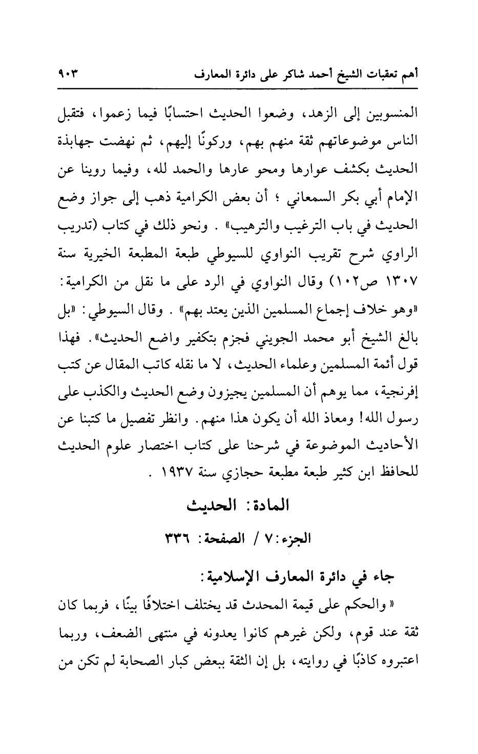 المنسوبين إلى الزهد، وضعوا الحديث احتسابًا فيما زعموا، فتقبل الناس موضوعاتهم ثقة منهم بهم، وركونًا إليهم، ثم نهضت جهابذة الحديث بكشف عوارها ومحو عارها والحمد لله، وفيما روينا عن الإمام أبي بكر السمعاني؛ أن بعض الكرامية ذهب إلى جواز وضع الحديث في باب الترغيب والترهيب". ونحو ذلك في كتاب (تدريب الراوي شرح تقريب النواوي للسيوطي طبعة المطبعة الخيرية سنة 1307 ص 102) وقال النواوي في الرد على ما نقل من الكرامية: "وهو خلاف إجماع المسلمين الذين يعتد بهم". وقال السيوطي: "بل بالغ الشيخ أبو محمد الجويني فجزم بتكفير واضع الحديث". فهذا قول أئمة المسلمين وعلماء الحديث، لا ما نقله كاتب المقال عن كتب إفرنجية، مما يوهم أن المسلمين يجيزون وضع الحديث والكذب على رسول الله! ومعاذ الله أن يكون هذا منهم. وانظر تفصيل ما كتبنا عن الأحاديث الموضوعة في شرحنا على كتاب اختصار علوم الحديث للحافظ ابن كثير طبعة مطبعة حجازي سنة 1937.