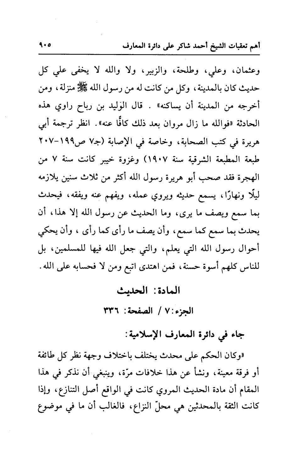وعثمان، وعلي، وطلحة، والزبير، ولا والله لا يخفى علي كل حديث كان بالمدينة، وكل من كانت له من رسول الله - صلى الله عليه وسلم - منزلة، ومن أخرجه من المدينة أن يساكنه". قال الوليد بن رباح راوي هذه الحادثة "فوالله ما زال مروان بعد ذلك كافًّا عنه". انظر ترجمة أبي هريرة في كتب الصحابة، وخاصة في الإصابة (جـ 7 ص 199 - 207 طبعة المطبعة الشرقية سنة 1907) وغزوة خيبر كانت سنة 7 من الهجرة فقد صحب أبو هريرة رسول الله أكثر من ثلاث سنين يلازمه ليلًا ونهارًا، يسمع حديثه ويروي عمله، ويفهم عنه ويفقه، فيحدث بما سمع ويصف ما يرى، وما الحديث عن رسول الله إلا هذا، أن يحدث بما سمع كما سمع، وأن يصف ما رأى كما رأى، وأن يحكي أحوال رسول الله التي يعلم، والتي جعل الله فيها للمسلمين، بل للناس كلهم أسوة حسنة، فمن اهتدى اتبع ومن لا فحسابه على الله.
