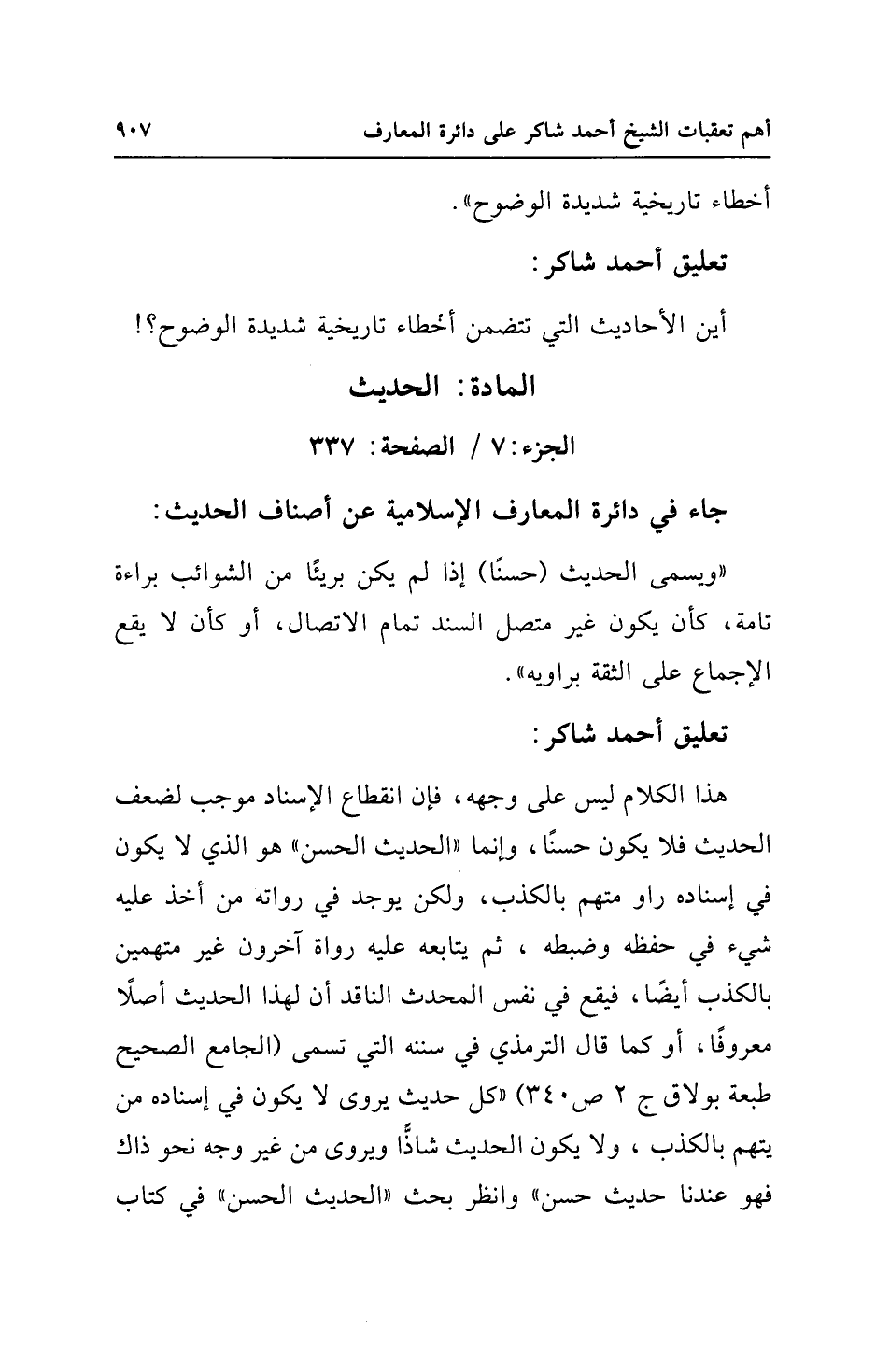 "ويسمى الحديث (حسنًا) إذا لم يكن بريئًا من الشوائب براءة تامة، كأن يكون غير متصل السند تمام الاتصال، أو كأن لا يقع الإجماع على الثقة براويه".