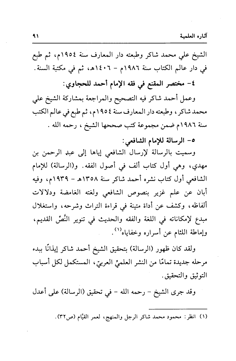 ولقد كان ظهور (الرسالة) بتحقيق الشيخ أحمد شاكر إيذانًا ببدء مرحلة جديدة تمامًا من النشر العلميَّ العربيّ، المستكمل لكل أسباب التوثيق والتحقيق.