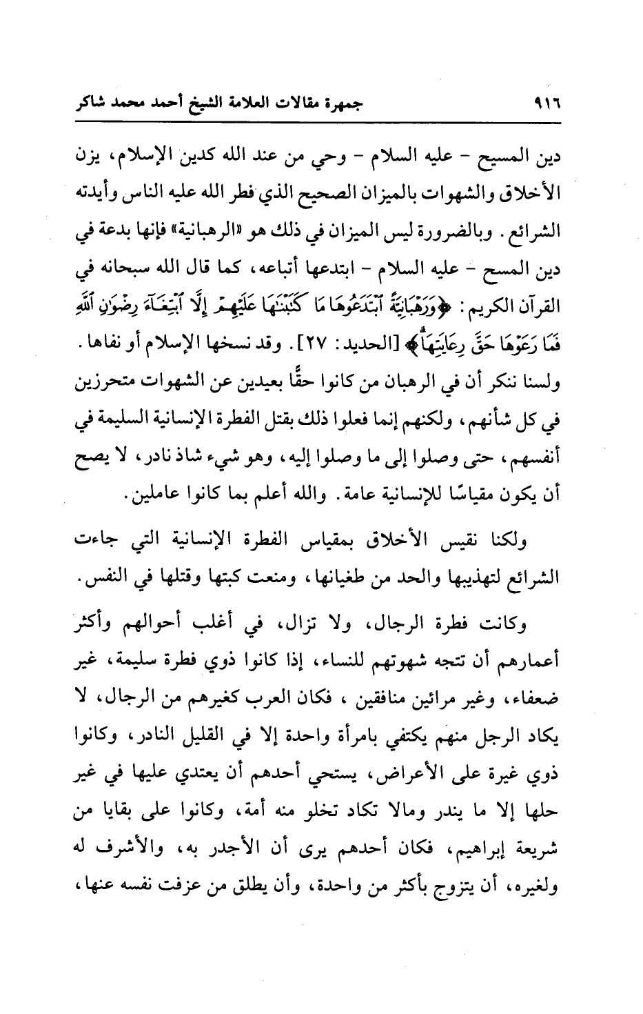دين المسيح - عليه السلام - وحي من عند الله كدين الإسلام، يزن الأخلاق والشهوات بالميزان الصحيح الذي فطر الله عليه الناس وأيدته الشرائع. وبالضرورة ليس الميزان في ذلك هو "الرهبانية" فإنها بدعة في دين المسيح - عليه السلام - ابتدعها أتباعه، كما قال الله سبحانه في القرآن الكريم: {وَرَهْبَانِيَّةً ابْتَدَعُوهَا مَا كَتَبْنَاهَا عَلَيْهِمْ إِلَّا ابْتِغَاءَ رِضْوَانِ اللَّهِ فَمَا رَعَوْهَا حَقَّ رِعَايَتِهَا} [الحديد: 27]. وقد نسخها الإسلام أو نفاها. ولسنا ننكر أن في الرهبان من كانوا حقًّا بعيدين عن الشهوات متحرزين في كل شأنهم، ولكنهم إنما فعلوا ذلك بقتل الفطرة الإنسانية السليمة في أنفسهم، حتى وصلوا إلى ما وصلوا إليه، وهو شيء شاذ نادر، لا يصح أن يكون مقياسًا للإنسانية عامة. والله أعلم بما كانوا عاملين.