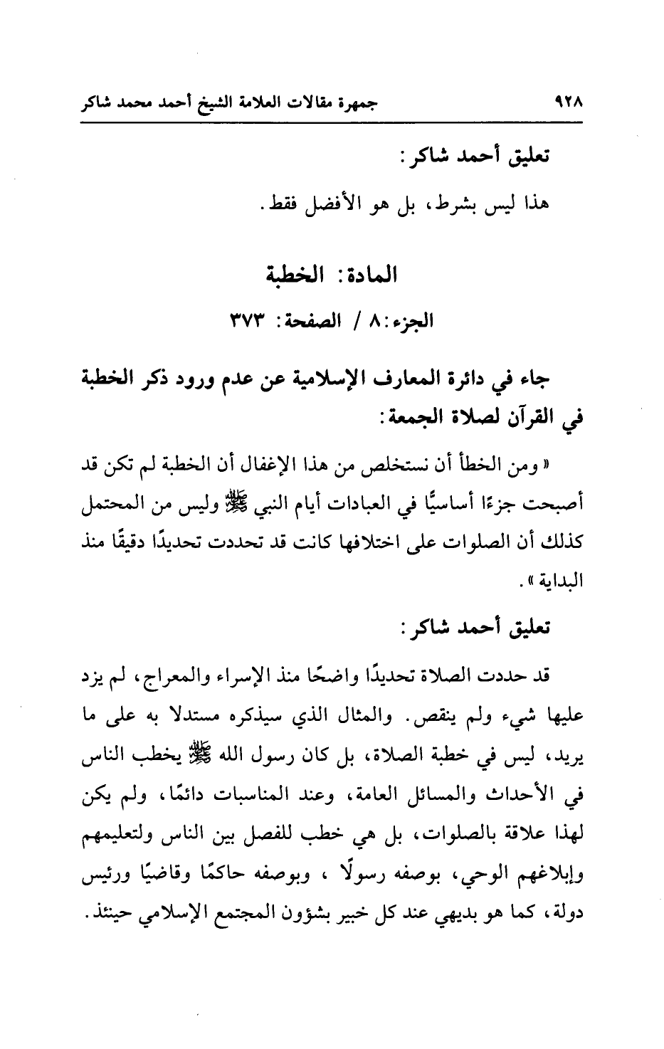 "ومن الخطأ أن نستخلص من هذا الإغفال أن الخطبة لم تكن قد أصبحت جزءًا أساسيًّا في العبادات أيام النبي - صلى الله عليه وسلم - وليس من المحتمل كذلك أن الصلوات على اختلافها كانت قد تحددت تحديدًا دقيقًا منذ البداية".
