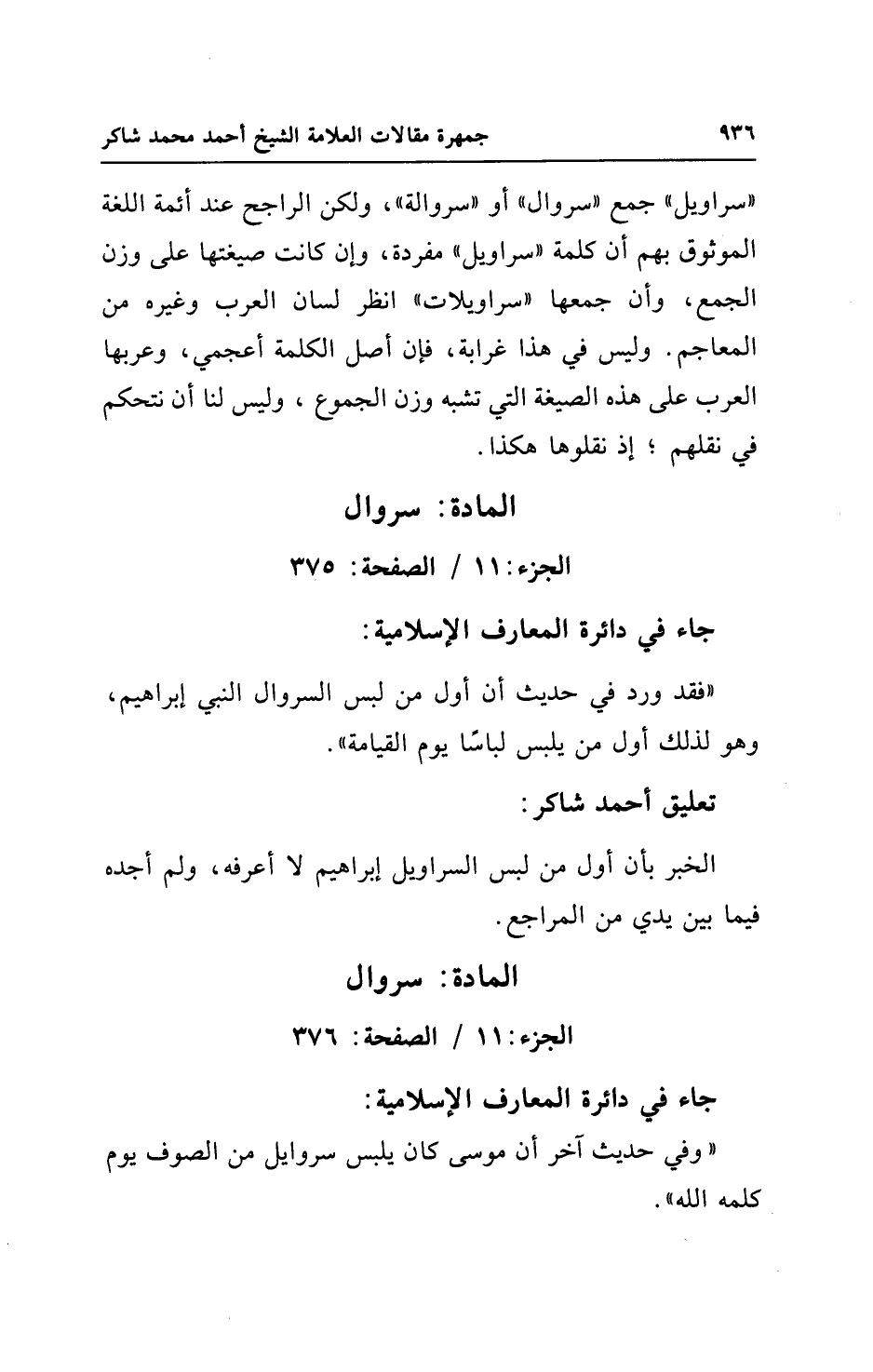 "سراويل" جمع "سروال" أو "سروالة"، ولكن الراجح عند أئمة اللغة الموثوق بهم أن كلمة "سراويل" مفردة، وإن كانت صيغتها على وزن الجمع، وأن جمعها "سراويلات" انظر لسان العرب وغيره من المعاجم. وليس في هذا غرابة، فإن أصل الكلمة أعجمي، وعربها العرب على هذه الصيغة التي تشبه وزن الجموع، وليس لنا أن نتحكم في نقلهم؛ إذ نقلوها هكذا.