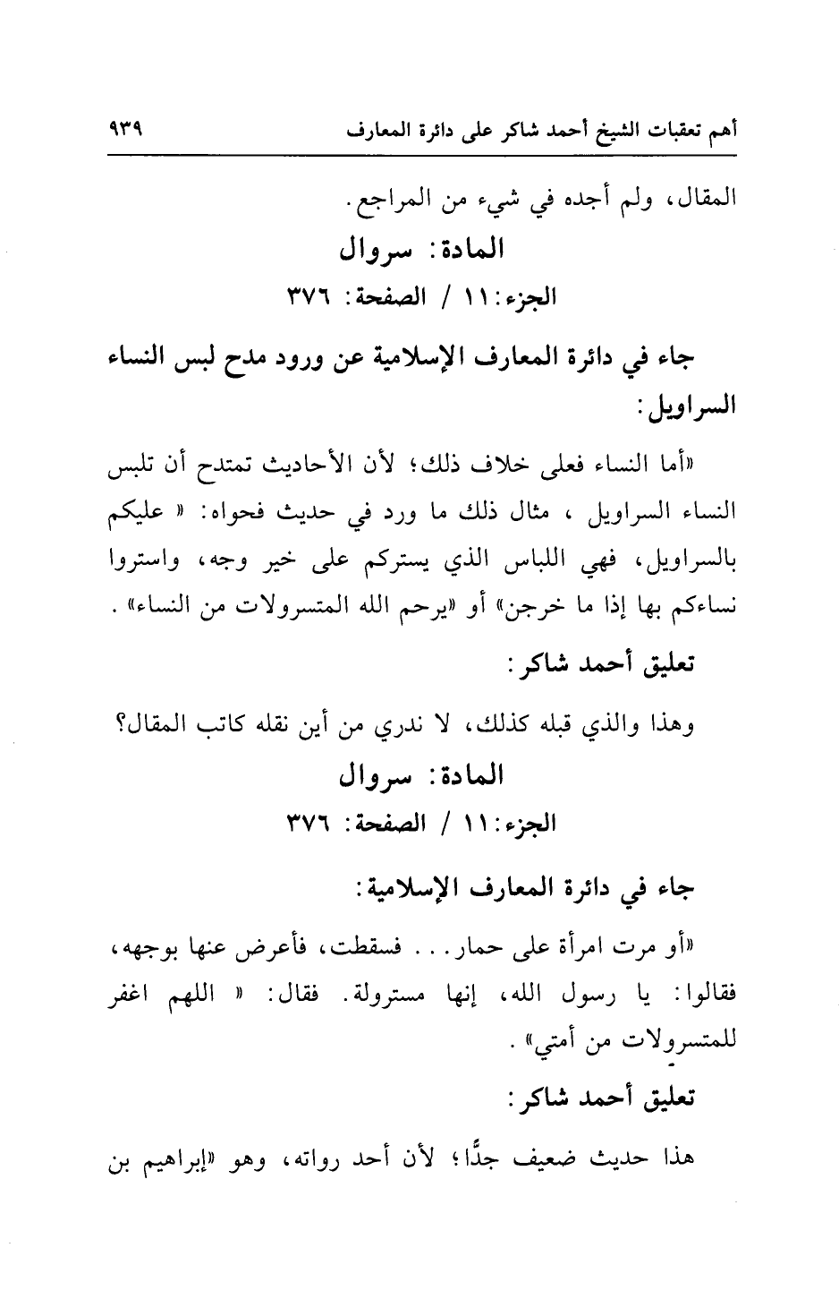 جاء في دائرة المعارف الإسلامية عن ورود مدح لبس النساء السراويل: