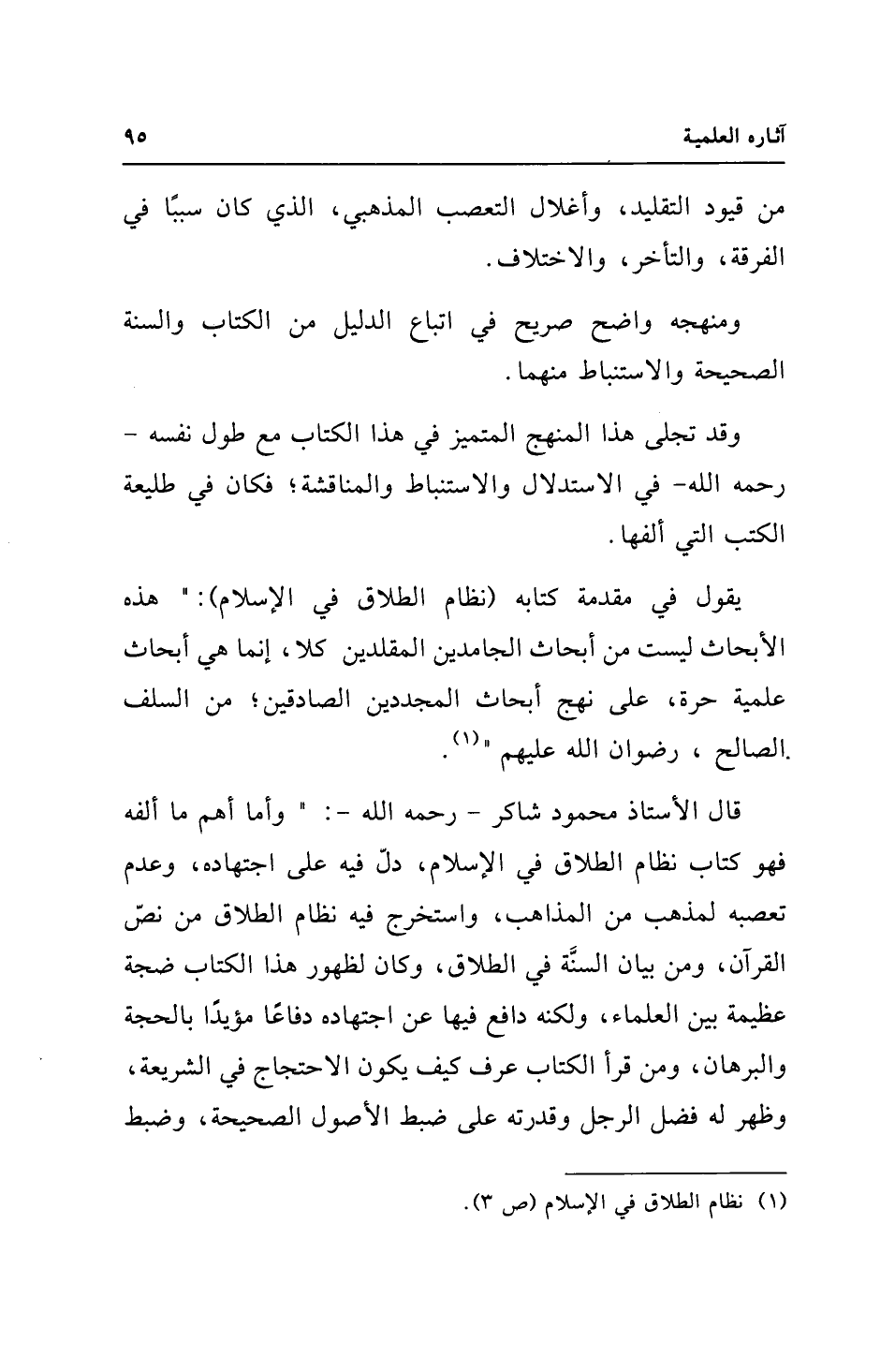قال الأستاذ محمود شاكر - رحمه الله -: "وأما أهم ما ألفه فهو كتاب نظام الطلاق في الإسلام، دلّ فيه على اجتهاده، وعدم تعصبه لمذهب من المذاهب، واستخرج فيه نظام الطلاق من نصّ القرآن، ومن بيان السنَّة في الطلاق، وكان لظهور هذا الكتاب ضجة عظيمة بين العلماء، ولكنه دافع فيها عن اجتهاده دفاعًا مؤيدًا بالحجة والبرهان، ومن قرأ الكتاب عرف كيف يكون الاحتجاج في الشريعة، وظهر له فضل الرجل وقدرته على ضبط الأصول الصحيحة، وضبط
