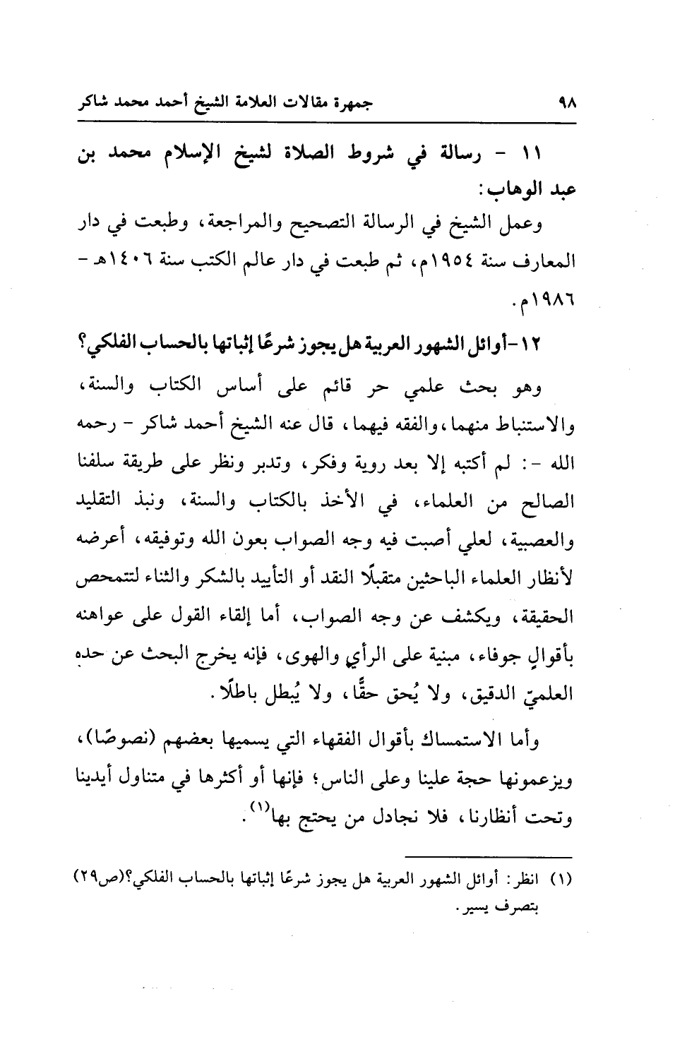 وهو بحث علمي حر قائم على أساس الكتاب والسنة، والاستنباط منهما، والفقه فيهما، قال عنه الشيخ أحمد شاكر - رحمه الله -: لم أكتبه إلا بعد روية وفكر، وتدبر ونظر على طريقة سلفنا الصالح من العلماء، في الأخذ بالكتاب والسنة، ونبذ التقليد والعصبية، لعلي أصبت فيه وجه الصواب بعون الله وتوفيقه، أعرضه لأنظار العلماء الباحثين متقبلًا النقد أو التأييد بالشكر والثناء لتتمحص الحقيقة، ويكشف عن وجه الصواب، أما إلقاء القول على عواهنه بأقوالٍ جوفاء، مبنية على الرأي والهوى، فإنه يخرج البحث عن حده العلميّ الدقيق، ولا يُحق حقًّا، ولا يُبطل باطلًا.