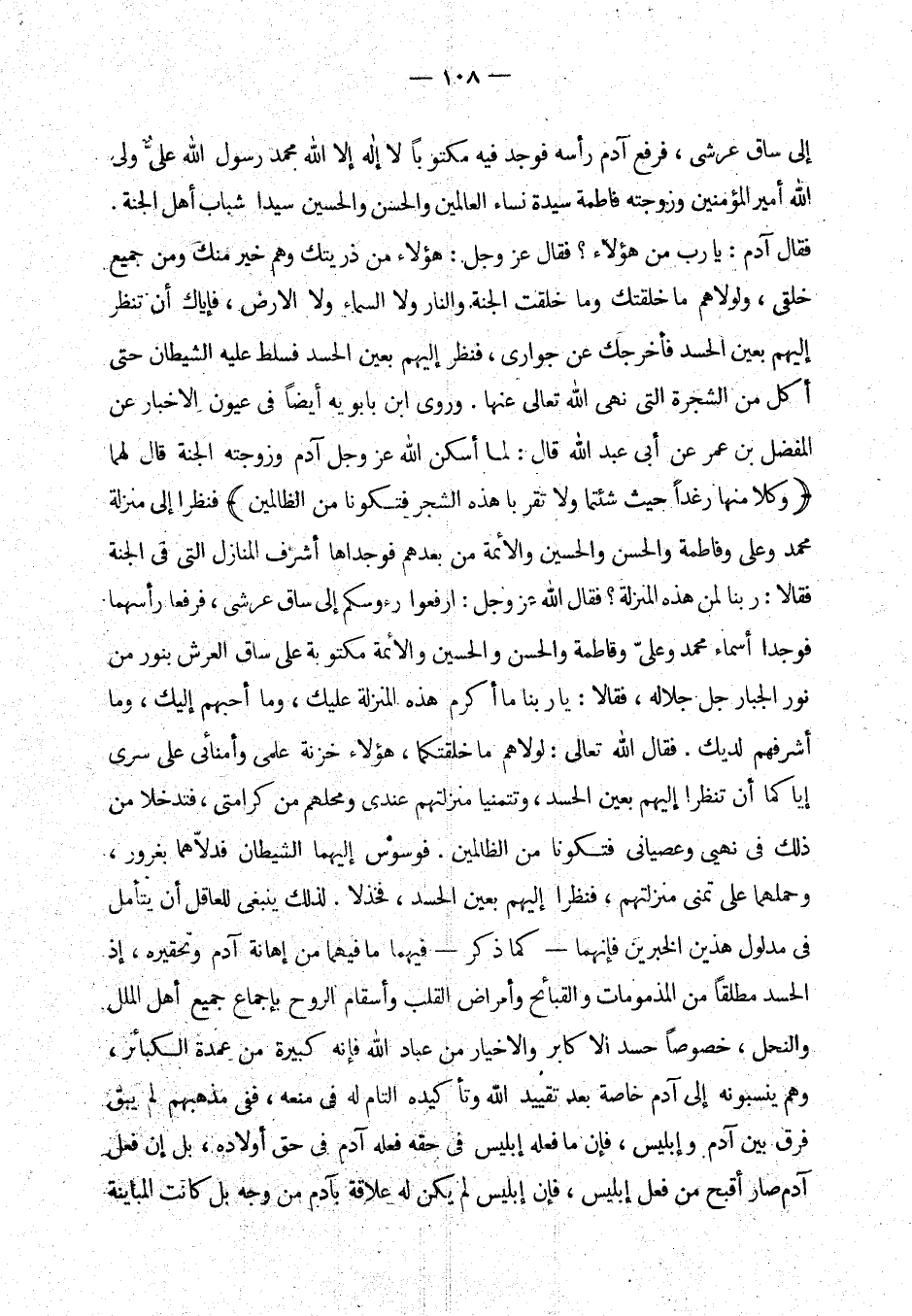 إلى ساق عرشي، فرفع رأسه فوجد فيه مكتوبا لا إله إلا الله محمد رسول الله علي ولي الله أمير المؤمنين وزوجته فاطمة سيدة نساء العالمين والحسن والحسين سيدا شباب أهل الجنة. فقال آدم: يا رب من هؤلاء؟ فقال عز وجل: هؤلاء من ذريتك وهم خير منك ومن جميع خلقي، ولولاهم ما خلقتك وما خلقت الجنة والنار ولا السماء ولا الأرض، فإياك أن تنظر إليهم بعين الحسد فأخرجك عن جواري، فنظر إليهم بعين الحسد فسلط عليه الشيطان حتى أكل من الشجرة التي نهى الله تعالى عنها.