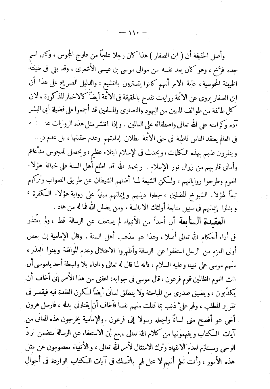 العقيدة السابعة: أن أحدا من الانبياء لم يستعف عن الرسالة قط ولم يعتذر في أداء أحكام الله تعالى أصلا، وهذا هو مذهب أهل السنة. وقال الإمامية إن بعض أولي العزم من الرسل استعفوا عن الرسالة وأظهروا الاعتلال وعدم الموافقة وبينوا العذر، منهم موسى - على نبينا وعليه السلام - فإنه لما قال له تعالى وناداه بلا واسطة أحد يا موسى أن ائت القوم الظالمين قوم فرعون، قال موسى في جوابه: أعفني من هذا الأمر إني أخاف أن يكذبون ويضيق صدري من المباحثة ولا ينطلق لساني أيضا لكونه العقدة فيه فيقصر في تقرير المطلب، ولهم علي ذنب بما قتلت منهم نفسا فأخاف أن يقتلوني بدله، فأرسل هرون أخي هو أفصح مني لسانا واجعله رسولا إلى فرعون. والإمامية يخرجون هذه المعاني من آيات الكتاب ويفهمونها من كلام الله تعالى، مع أن الاستعفاء عن الرسالة متضمن لرد الوحي ومستلزم لعدم الانقياد وترك الامتثال لأمر الله تعالى، والأنبياء معصومون عن مثل هذه الأمور. وأنت تعلم أنهم لا محل لهم بالتمسك في آيات الكتاب الوادرة في أحوال