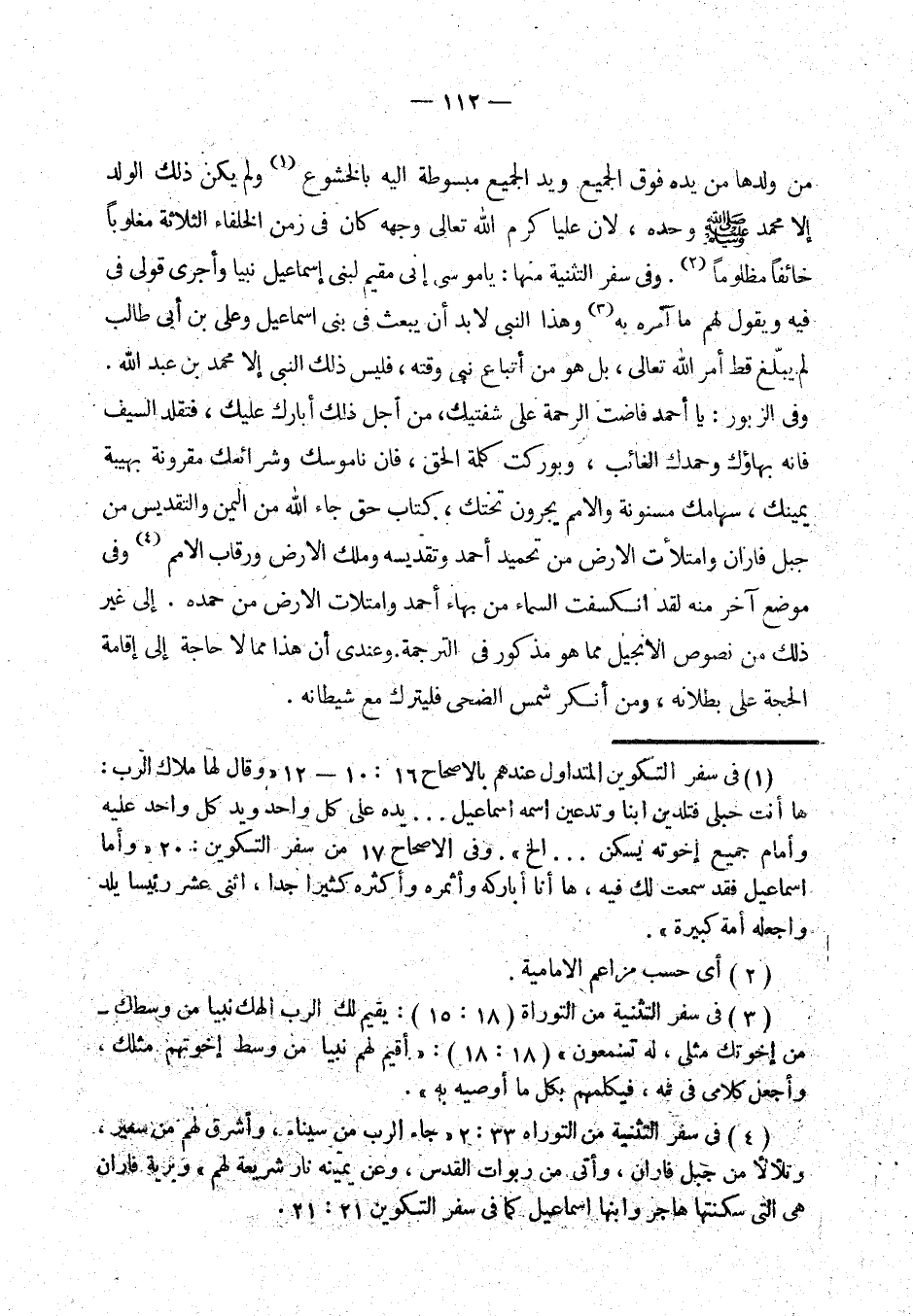 من ولدها من يده فوق الجميع ويد الجميع مبسوطة إليه بالخشوع (¬1) ولم يكن ذلك الولد إلا محمد - صلى الله عليه وسلم - وحده لأن عليا كرم الله وجهه كان في زمن الخلفاء الثلاثة مغلوبا خائفا مظلوما. (¬2) وفي سفر التثنية منها: يا موسى إني مقيم لبني إسماعيل نبيا وأجرى قولي في فيه ويقول لهم ما آمره به. (¬3) وهذا النبي لا بد أن يبعث في بني إسماعيل، وعلي بن أبي طالب لم يبلغ قط ما أمر الله تعالى بل هو من أتباع نبي وقته فليس ذلك النبي إلا محمد بن عبد الله. وفي الزبور: يا أحمد فاضت الرجمة على شفتيك من أجل ذلك أبارك عليك فتقلد السيف فإنه بهاؤك وحمدك الغائب وبوركت كلمة الحق فإن ناموسك وشرائعك مقرونة بهيبة يمينك سهامك مسنونة والأمم يجرون تحتك كتاب حق الله من اليمن والتقديس من جبل فاران وامتلأت الأرض من تحميد أحمد وتقديسه وملك الأرض ورقاب الأمم. (¬4) وفي موضع آخر منه لقد انكسفت السماء من بهاء أحمد وامتلأت الأرض من حمده. (¬5) إلى غير ذلك من نصوص الإنجيل مما هو مذكور في الترجمة. وعندي أن هذا مما لا حاجة إلى إقامة الحجة على بطلانه ومن أنكر شمس الضحى فليترك مع شيطانه. (¬6)