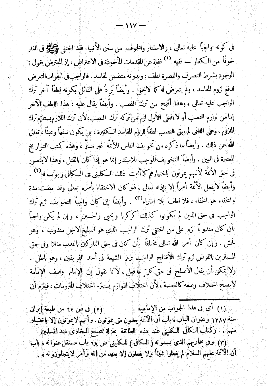 وأيضا إن كان واجبا للتخويف لزم ترك الواجب في حق الذين لم يكونوا كذلك كزكريا (¬4) ويحيى (¬5) والحسين، (¬6) وإن لم يكن واجبا بأن كان مندوبا لزم على من اختفى ترك الواجب الذي هو التبليغ لأجل مندوب، وهو فحش. وإن كان أمر الله تعالى مختلفا بأن كان في حق التاركين بالندب مثلا وفي حق المستترين بالفرض لزم ترك الأصلح الواجب بزعم الشيعة في أحد الفريقين، وهو باطل. (¬7) ولا يمكن أن يقال الأصلح في حق كل ما فعل، لأنا نقول إن الإمام بوصف الأمامة لا يصح اختلاف وصفه كالعصمة، لأن اختلاف اللوازم يستلزم اختلاف الملزومات، فيلزم أن