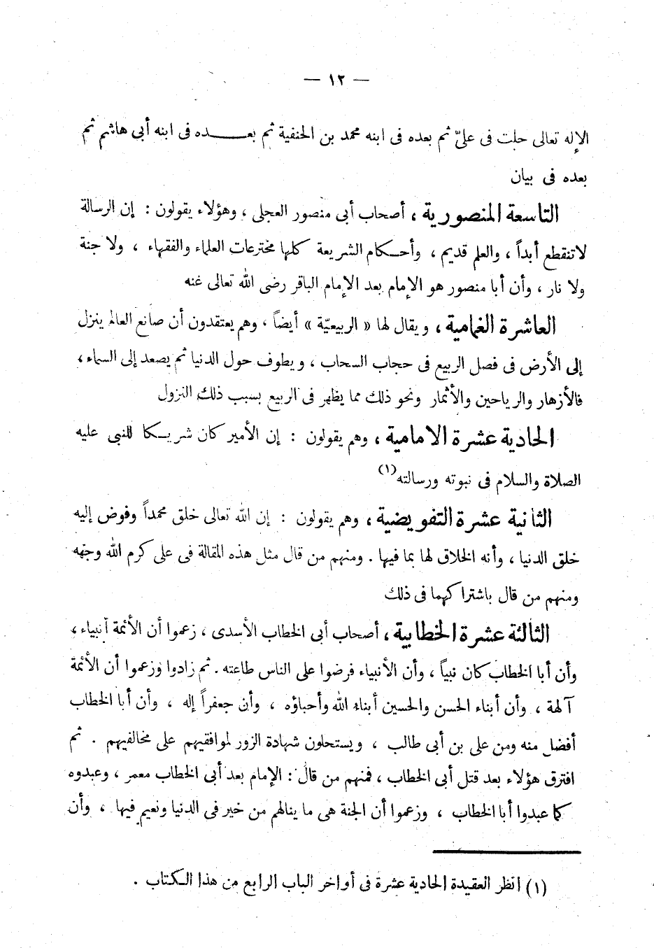 الثانية عشر التفويضية: وهم يقولون: إن الله تعالى خلق محمدا وفوض غليه خلق الدنيا، وأنه الخلاق لها بما فيها. ومنهم من قال مثل هذه المقالة في علي كرم الله وجهه ومنهم من قال باشتركهما في ذلك. (¬6)