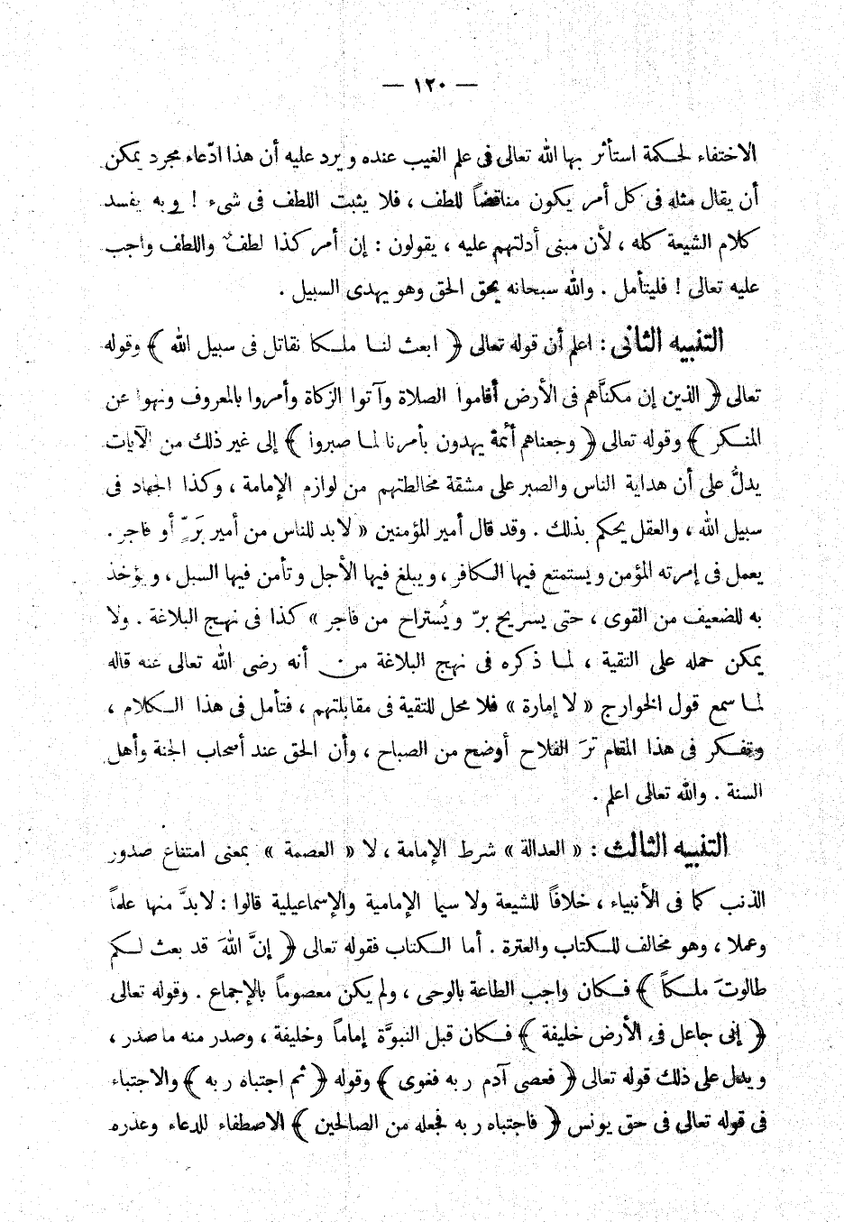 التنبيه الثاني: اعلم أن قول الله تعالى {ابعث لما ملكا نقاتل في سبيل الله} وقوله تعالى {الذين إن مكناهم في الأرض أقاموا الصلاة وآتوا الزكاة وأمروا بالمعروف ونهوا عن المنكر} وقوله تعالى {وجعلناهم أئمة يهدون بأمرنا لما صبروا} إلى غير ذلك من الآيات يدل على أن هداية الناس والصبر على مشقة مخالطتهم من لوازم الإمامة، وكذا الجهاد في سبيل الله، والعقل يحكم بذلك. وقد قال أمير المؤمنين «لابد للناس من أمير برٍ أو فاجر. يعمل في إمرته المؤمن ويستمع فيها الكافر، ويبلغ فيها الأجل وتأمن فيها السبل، ويؤخذ به للضعيف من القوي، حتى يستريح بر ويستراح من فاجر» كذا في نهج البلاغة. ولا يمكن حمله على التقية، لما ذكره في نهج البلاغة من أنه - رضي الله تعالى عنه - قاله لما سمع قول الخوارج «لا إمارة» فلا محل للتقية في مقابلتهم، فتأمل في هذا الكلام، وتفكر في هذا المقام تر الفلاح أوضح من الصباح، وأن الحق عند أصحاب الجنة وأهل السنة. والله تعالى أعلم.