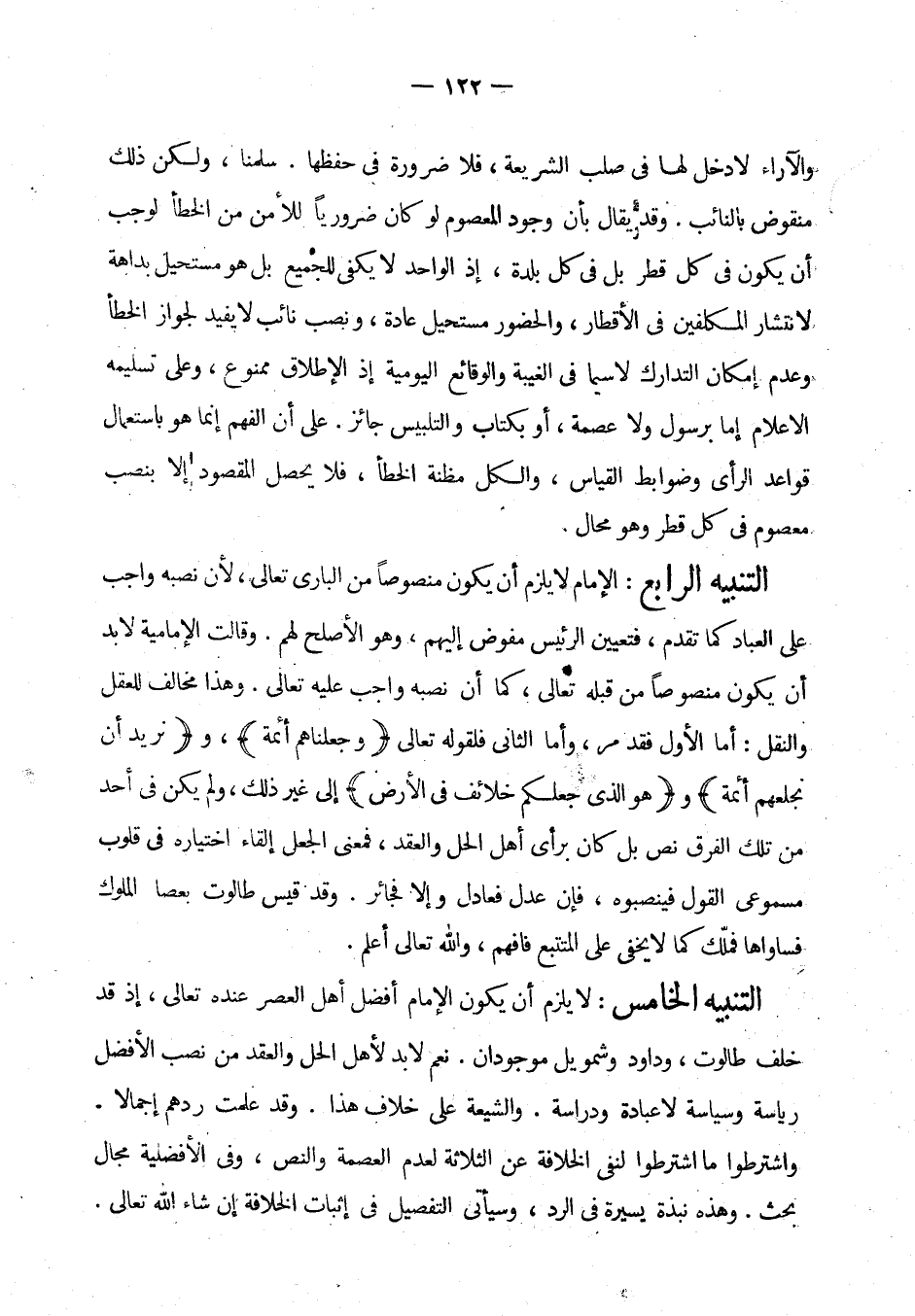 التنبيه الرابع: الإمام لا يلزم أن يكون منصوصا من الباري تعالى، لأن نصبه واجب على العباد كما تقدم، فتعيين الرئيس مفوض إليهم، وهو الأصلح لهم. وقالت الإمامية لا بد أن يكون منصوصا من قبله تعالى، كما أن نصبه واجب عليه تعالى. (¬3) وهذا مخالف للعقل والنقل. أما الأول فقد مر، وأما الثاني فلقوله تعالى {وجعلناهم أئمة}، {ونريد أن نمن على الذين استضعفوا في الأرض ونجعلهم أئمة}، {وهو الذي جعلكم خلائف في الأرض} إلى غير ذلك، ولم يكن في احد من تلك الفرق نص بل كان برأي أهل الحد والعقد، فمعنى الجعل إلقاء اختياره في قلوب مسموعي القول فينصبوه، فإن عدل فعادل وإلا فجائز. وقد قيس طالوت بعصا الملوك فساواها فملك (¬4) كما لا يخفى على المتتبع فافهم، والله تعالى اعلم.