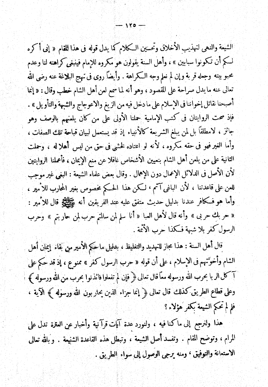 وقال بعض علماء الشيعة: البغي غير موجب للعن على قاعدتنا، لأن الباغي آثم، لكن هذا الحكم مخصوص بغير المحارب للأمير، وأما هو فكافر عندنا بدليل حديث متفق عليه عند الفريقين أنه - صلى الله عليه وسلم - قال للأمير: «حربك حربي» (¬3) وأنه قال لأهل العبا: «أنا سلم لمن سالمتم حرب لمن حاربتم» (¬4) وحرب الرسول كفر بلا شبهة فكذا حرب الأئمة.