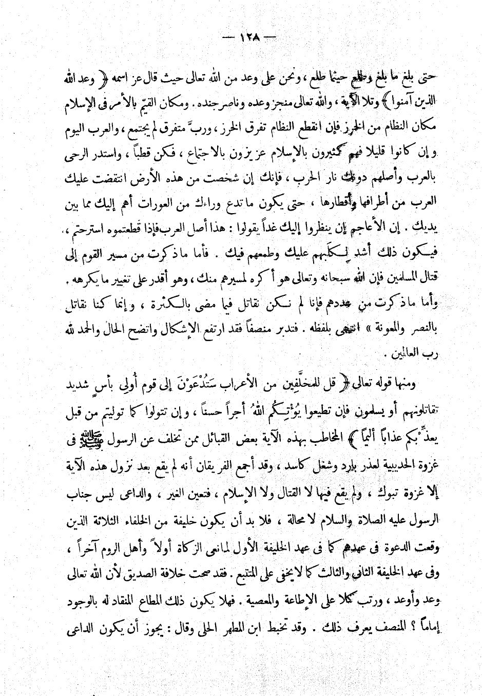 ومنها قوله تعالى {قل للمخلفين من الأعراب ستدعون إلى قوم أولى بأس شديد تقاتلونهم أو يسلمون فإن تطيعوا يؤتكم الله أجرا حسنا وإن تتولوا كما توليتم من قبل يعذبكم عذابا أليما} المخاطب بهذه الآية بعض القبائل ممن تخلف عن الرسول - صلى الله عليه وسلم - في غزوة الحديبية لعذر بارد وشغل كاسد، (¬2) وقد أجمع الفريقان أنه لم يقع بعد نزول هذه الآية إلا غزوة تبوك، ولم يقع فيها لا القتال ولا الإسلام، فتعين الغير. والداعي ليس جناب الرسول - عليه الصلاة والسلام - لا محالة، فلا بد أن يكون خليفة من الخلفاء الثلاثة الذين وقعت الدعوة في عهدهم كما في عهد الخليفة الأول لمانعي الزكاة أولا وأهل الروم آخرا، وفي عهد الخليفة الثاني والثالث كما لا يخفى على المتتبع. فقد صحت خلافة الصديق لأن الله تعالى وعد وأوعد، ورتب كلا على الإطاعة والمعصية. فهلا يكون ذلك المطاع المنقاد له بالوجود إماما؟ المنصف يعرف ذلك.