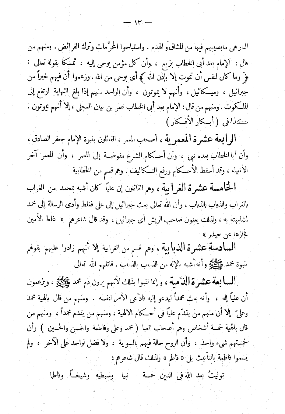 الرابعة عشرة المعمرية: أصحاب المعمر، القائلون بنبوة الإمام جعفر الصادق، وأن أبا الخطاب بعده نبي، وأن أحكام الشرع مفوضة إلى المعمر، وأن المعمر آخر الأنبياء، وقد أسقط الأحكام ورفع التكاليف. وهم قسم من الخطابية. (¬2)